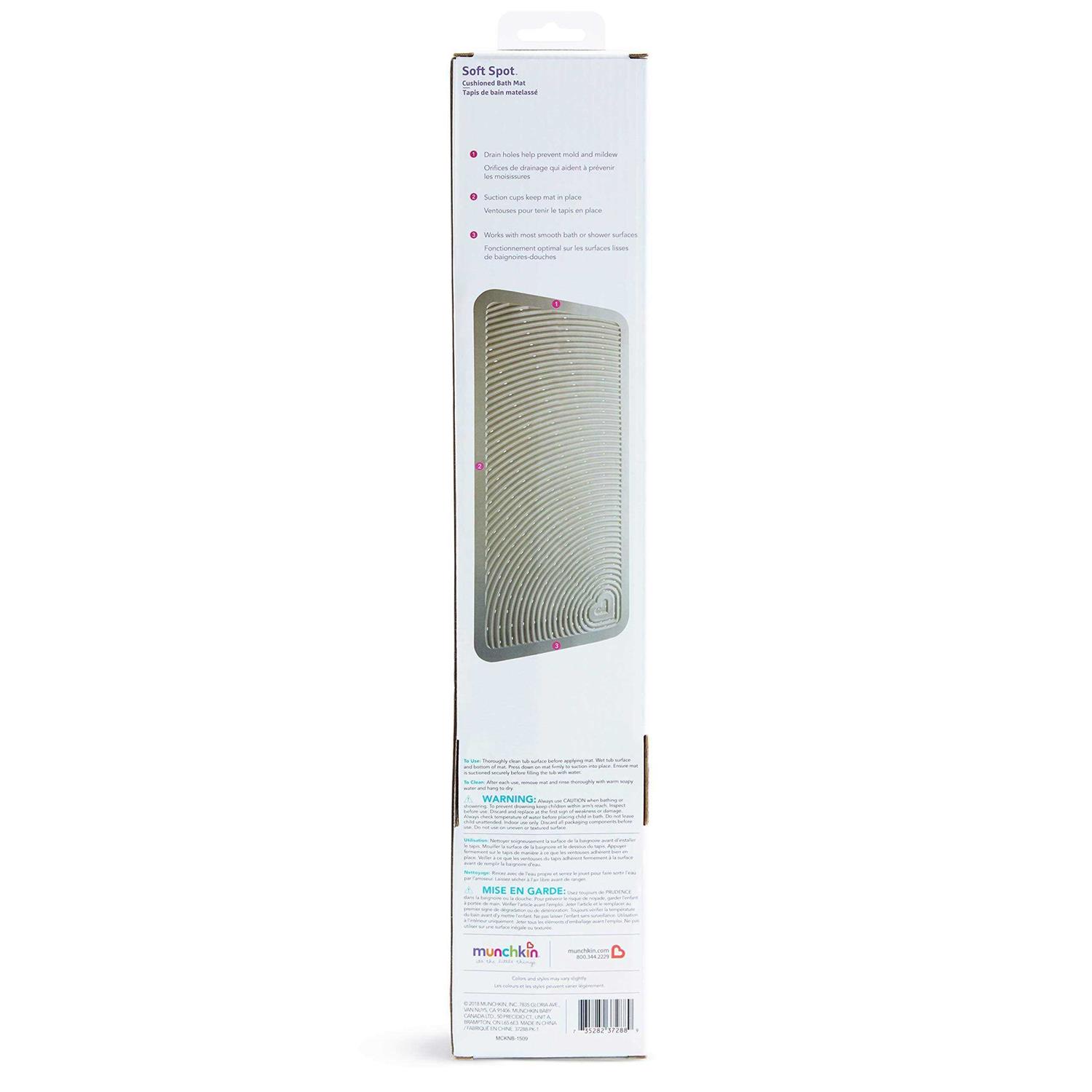 Munchkin Soft Spot Cushioned Bath Mat is a bath mat with grooves throughout the design creating a sturdy grip and extra comfort. Strong suction cups keep this mat secure to the base of the tub or shower – this mat will work with most smooth surfaces. Plus, drain holes help to prevent mold and mildew growth. Munchkin knows when it comes to bath time, safety comes first. Keep your little one from slipping and sliding with the Soft Spot cushioned bath mat. Great for baby or adults! Cushioned bath mat with built in grip Drain holes help prevent mold and mildew growth Strong hold suction cups keep mat in place Ripple pattern creates a soft, textured surface to provide extra security for little one Works with most smooth bath and shower surfaces BPA-free Bath mat measures 36” L x 17” W.