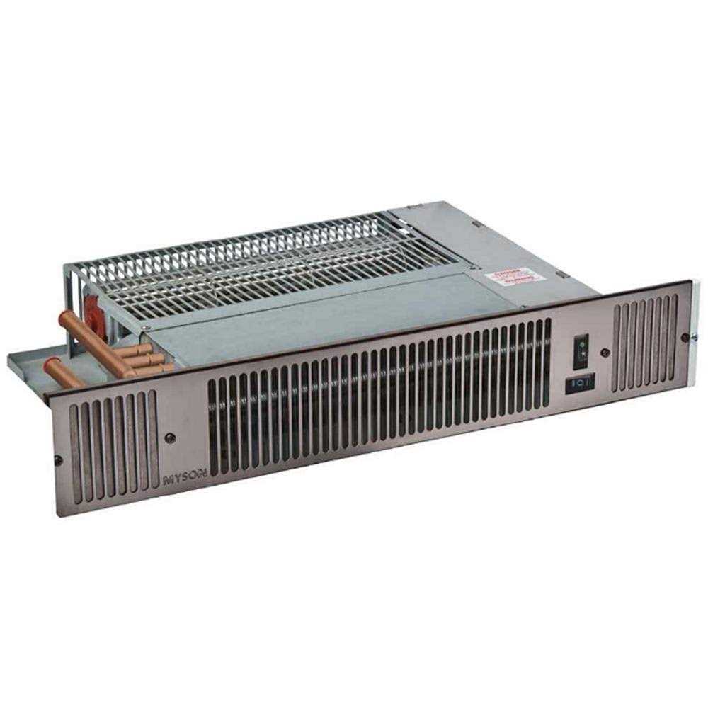 Myson Hydronic Kickspace Heater WHIII 9000 Black 9949 BTU 120V Myson is a big name in the world of hydronic heat setting the standard of design and performance in high efficiency compact kickspace heaters. Myson’s Whispa III 9000 kickspace heaters are compact saves space and can be installed in hard to heat areas. Myson Whispa III 9000 are quiet & efficient while delivering convection heat where and when you need it. Myson Whispa III 9000 toe kick heater is engineered to simply last longer stay quieter and deliver a heat output you can rely on for accuracy and reliability year after year. They fit easily under a counter window seat or stairs. The Whispa III 9000 kick space heater delivers reliability. Each unit has sealed porous bronze sleeve bearings a rugged two piece motor a triple reinforced tangential fan and a high strength rocker switch assembly. Each unit is fully tested thoroughly inspected and hand packaged at the factory to arrive at the site ready to install and ready to run. Installs with ease. Inlet and outlet connections are conveniently located together and are easily accessible from the rear. The electrical controls allow for the unit to be controlled directly with the two-speed switch or with a remote speed controller. Service is a snap. The two-piece motor snaps out with an easy quarter turn for quick replacement and a quick service call.