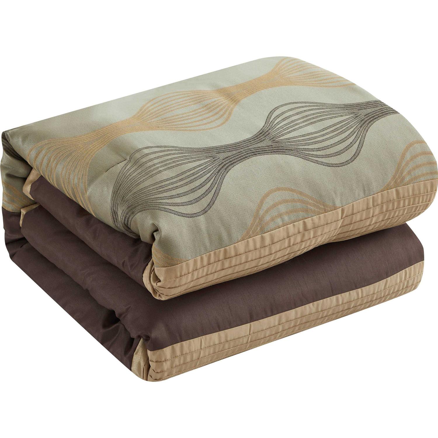 This seven-piece comforter set features rich tones and textures that are accented with geometric designs, solid colors, and crisp lines. This set includes a comforter, two pillow shams, three decorative pillows, and a bed skirt and will add an upscale look to any bedroom. The modern, geometric pattern showcases neutral shades of brown, cream, and gold to lend a rich and luxurious feel to your decor. The complete bed set built to last, this bedding set is made with strict quality control standards and comes with everything you need for a complete bedroom makeover. This bedding set must be dry cleaned to ensure quality comfort.