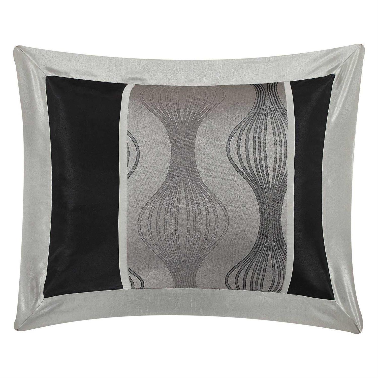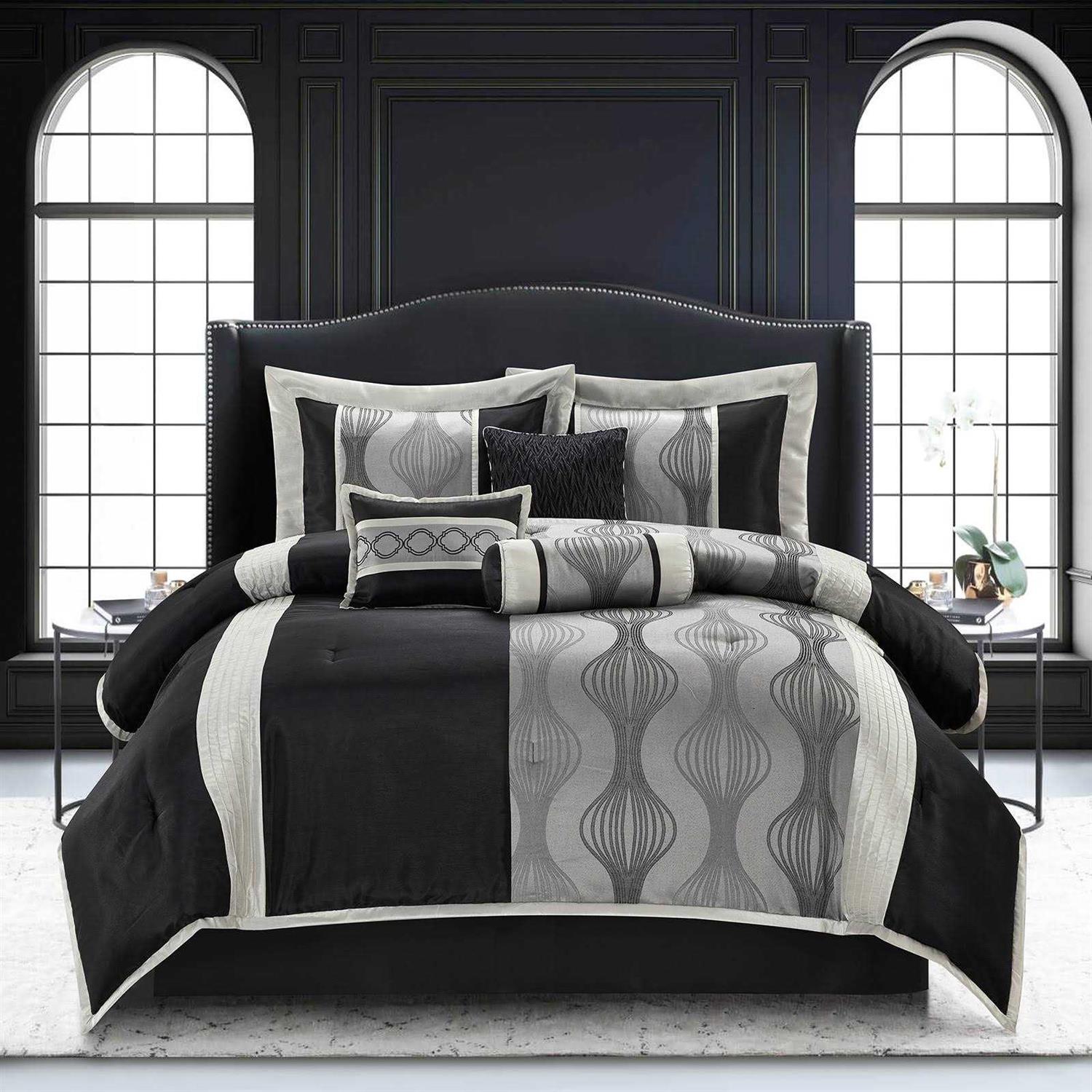 Includes Comforter 2 Shams Bedskirt 3 Pillows. Choose from available sizes and colors. Polyester shell and filling. Abstract design. Machine washable for your convenience. This set includes a comforter two pillow shams three decorative pillows and a bed skirt that will add an upscale look to any bedroom. The modern geometric pattern lend a rich and luxurious feel to your decor. Size: California King. Color: Black/Silver.