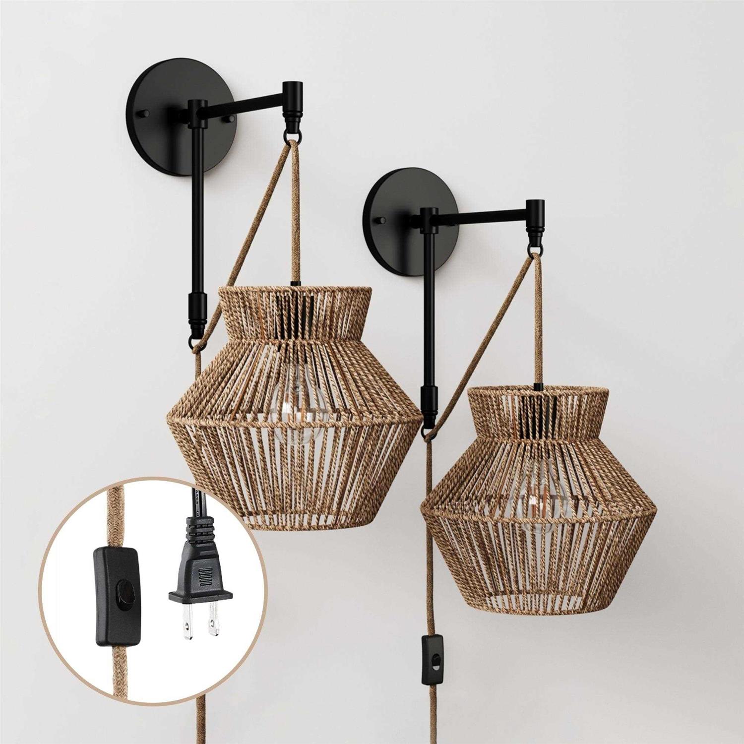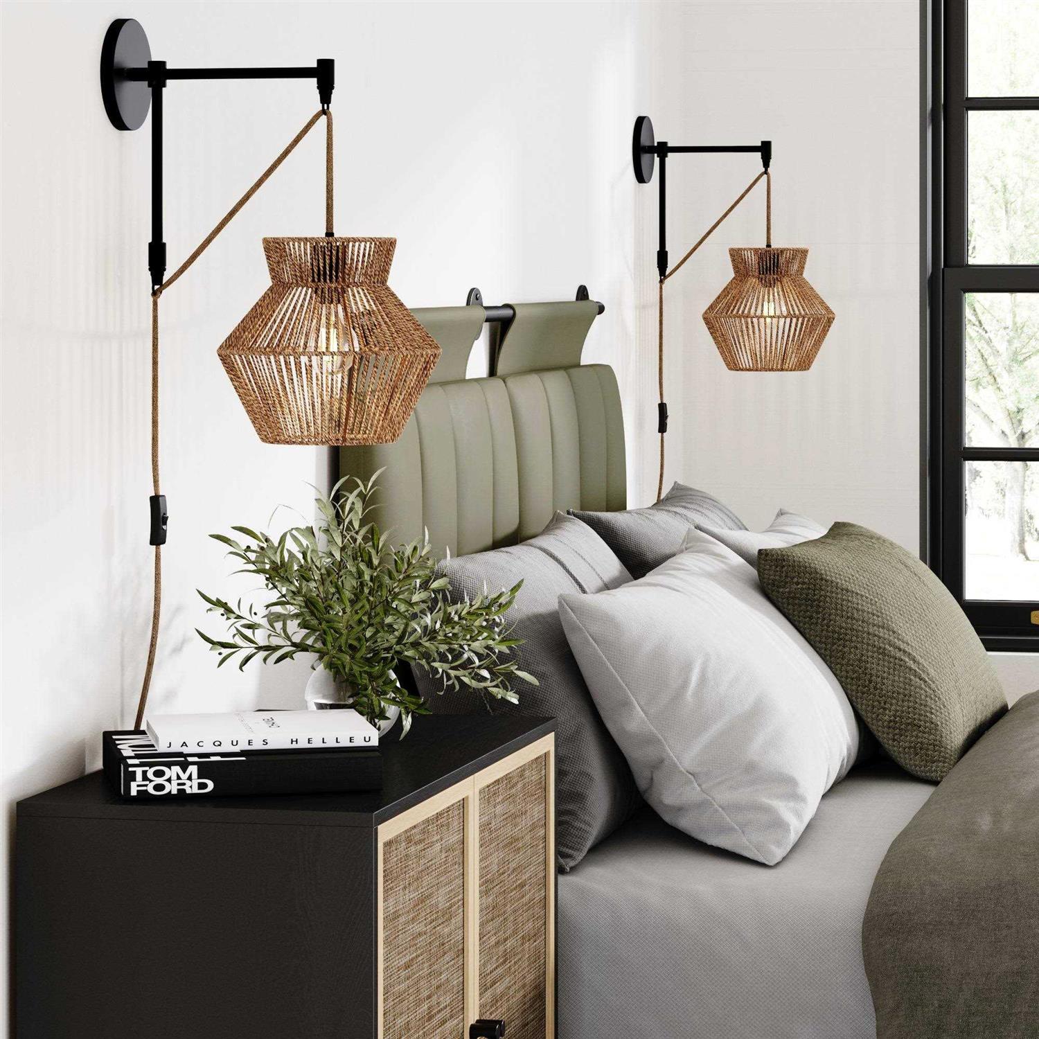 Nathan James Ariel 1-Light Bohemian Plug-in Wall Sconce Adjustable Height, Bedside Reading Lamp with Seagrass Shade, Decorative Cord, and Woven Rope