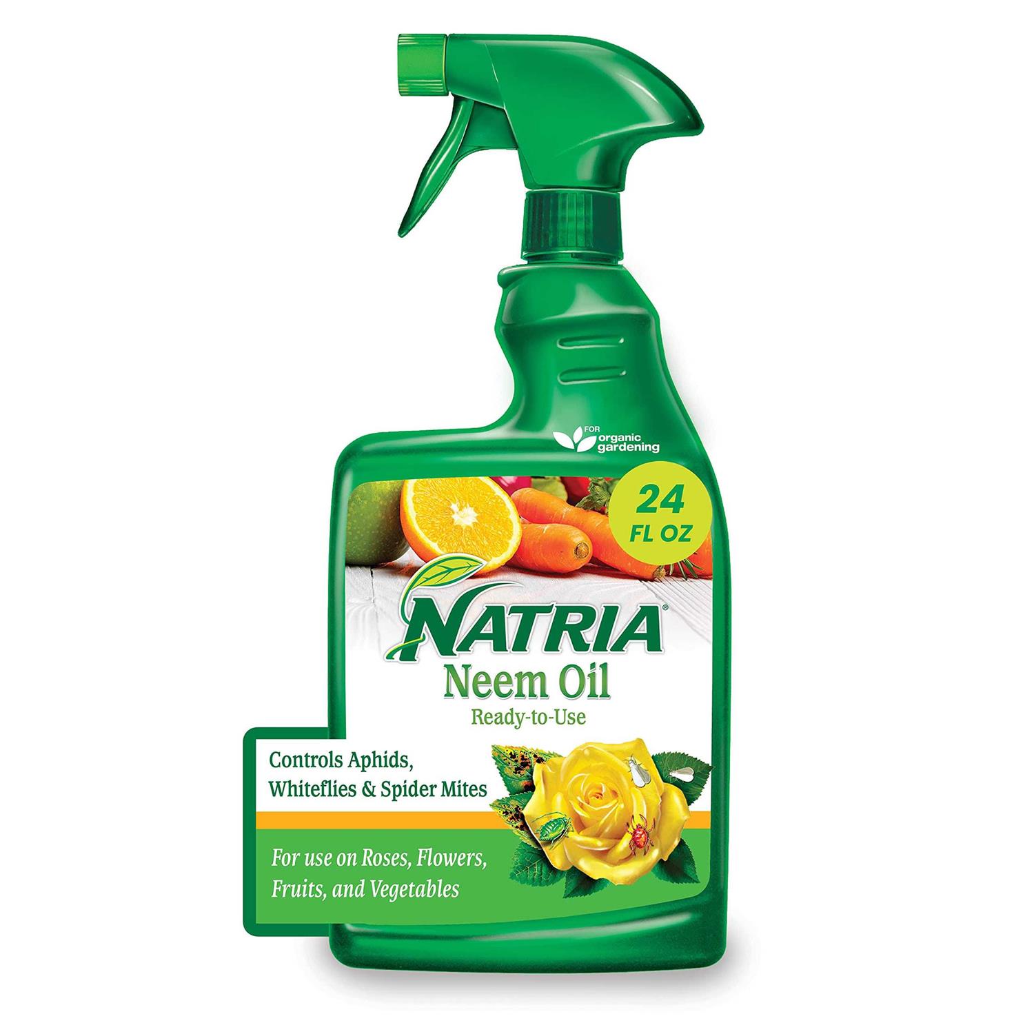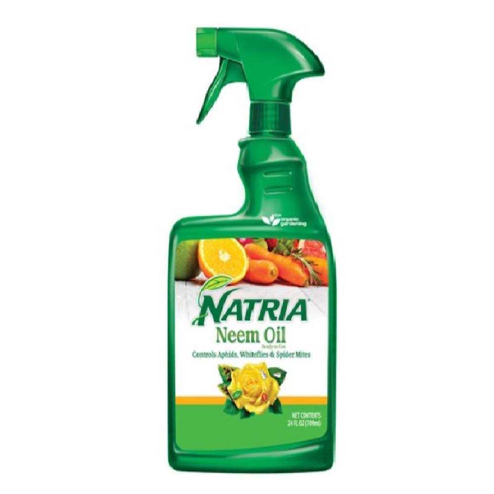 Item description Bayer Advanced Natria Neem Oil Ready-to-Use controls insects such as aphids, whiteflies and spider mites and controls diseases, including black spot, rust and powdery mildew. This product is for use on roses, flowers, houseplants, ornamental shrubs, fruits, nuts and vegetables in and around the home and home garden. It can be used up to the day of harvest.