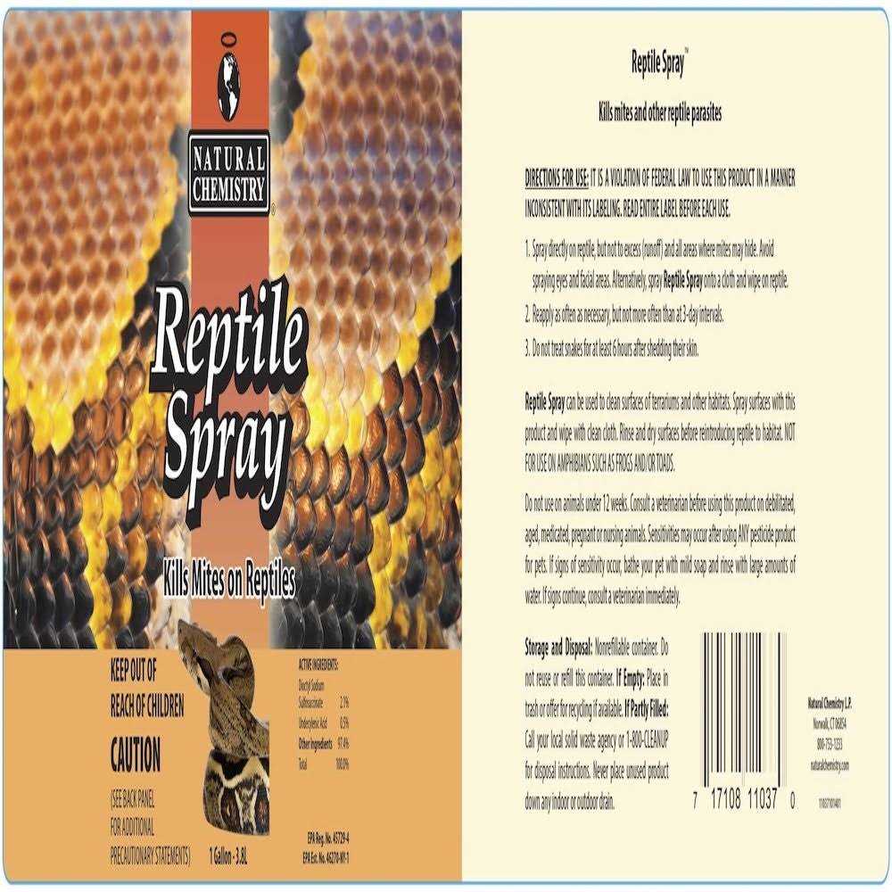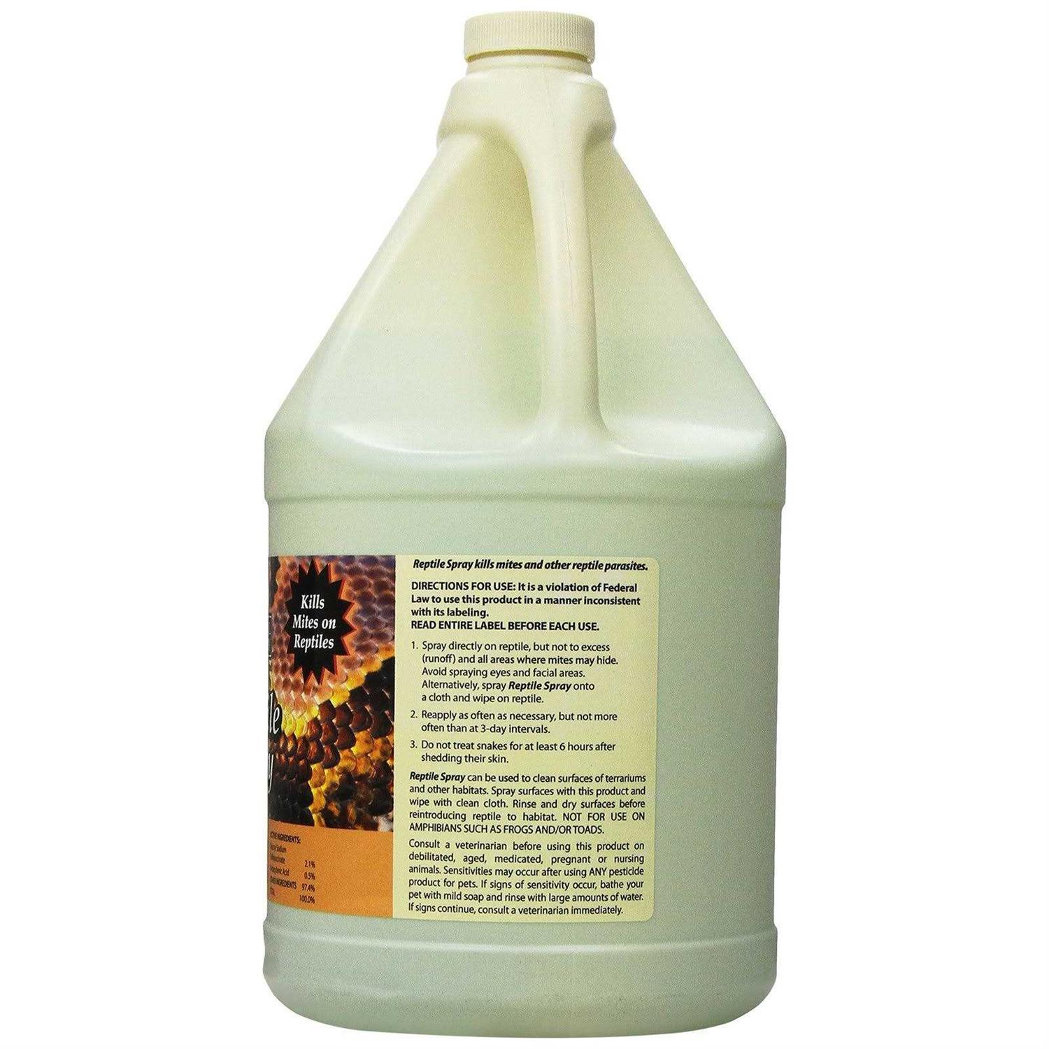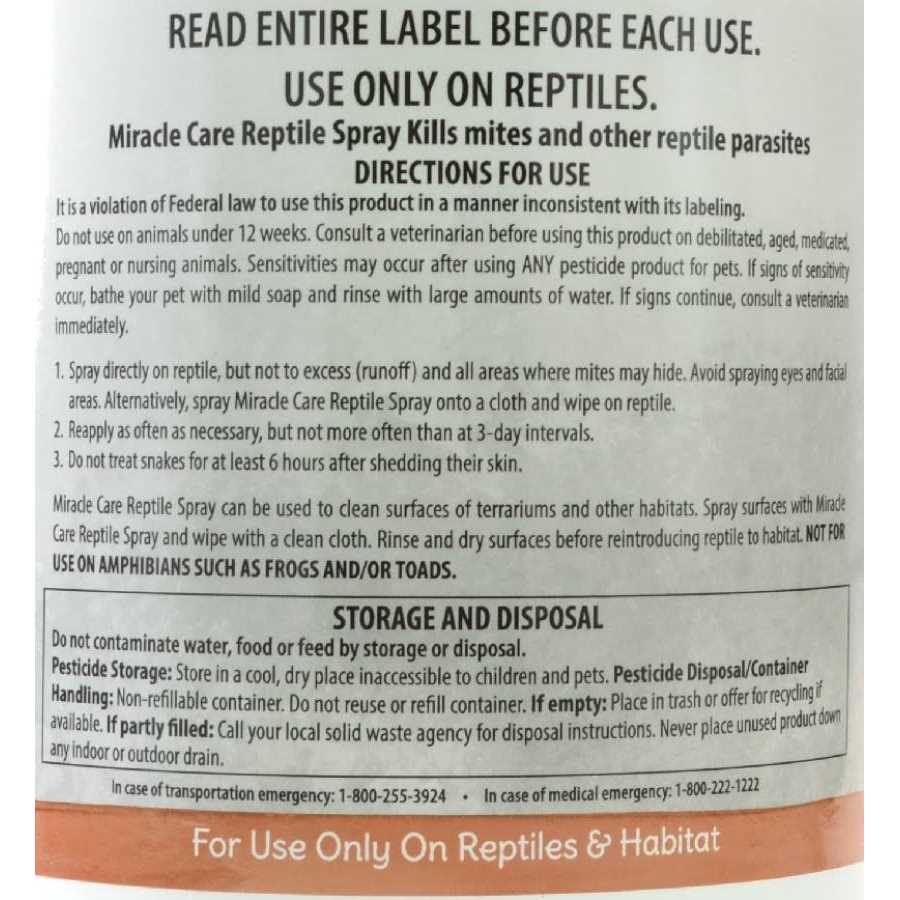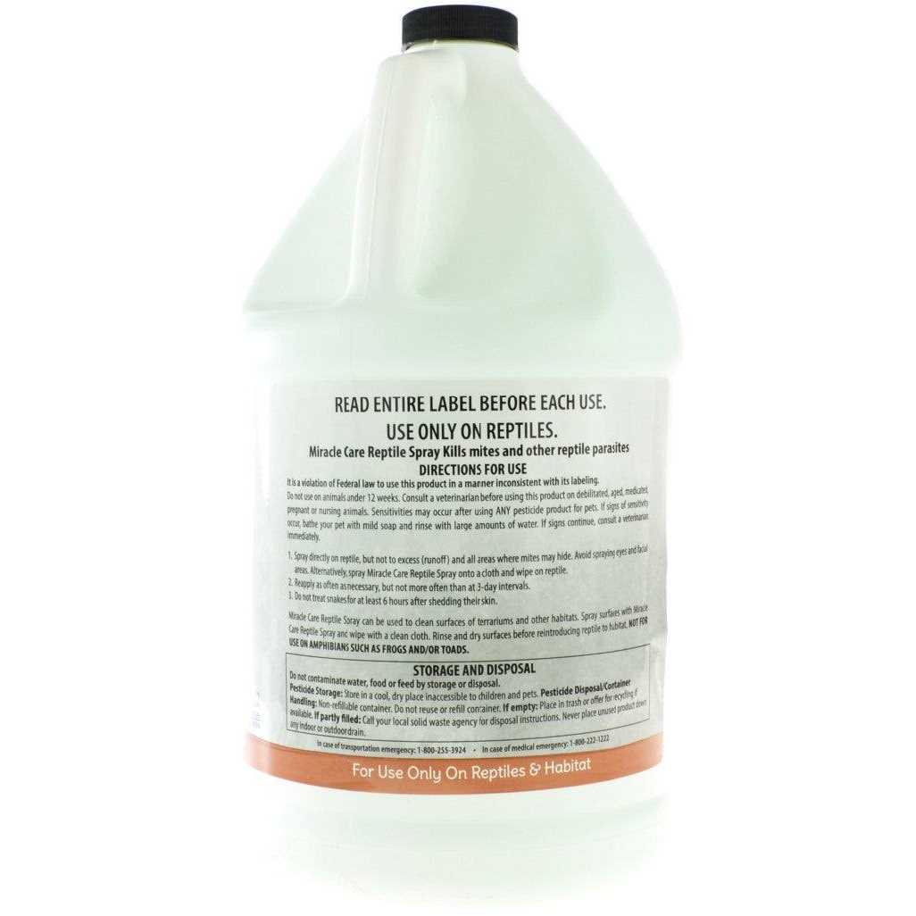 Natural Chemistry Miracle Care Reptile Mite Spray, 1-gal bottle; Help keep pesky mites off your scaly sidekick with Miracle Care’s Reptile Mite Spray. This liquid formula is made in the USA and designed to kill mites, lice and external parasites on contact. This powerful formula is safe to use directly on snakes, lizards and other reptiles. Use it to combat insects of all life stages, quickly and effectively eliminating them from your reptile and his environment. It can also be used to clean surfaces and substrate of terrariums, as needed!