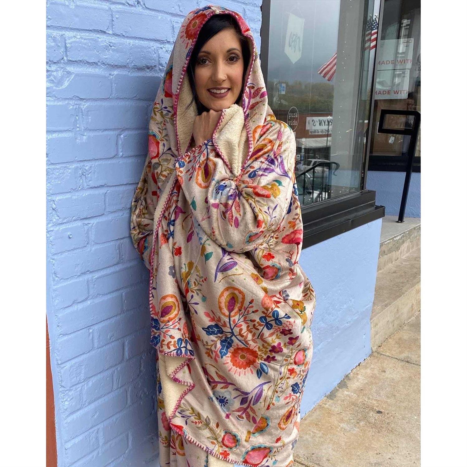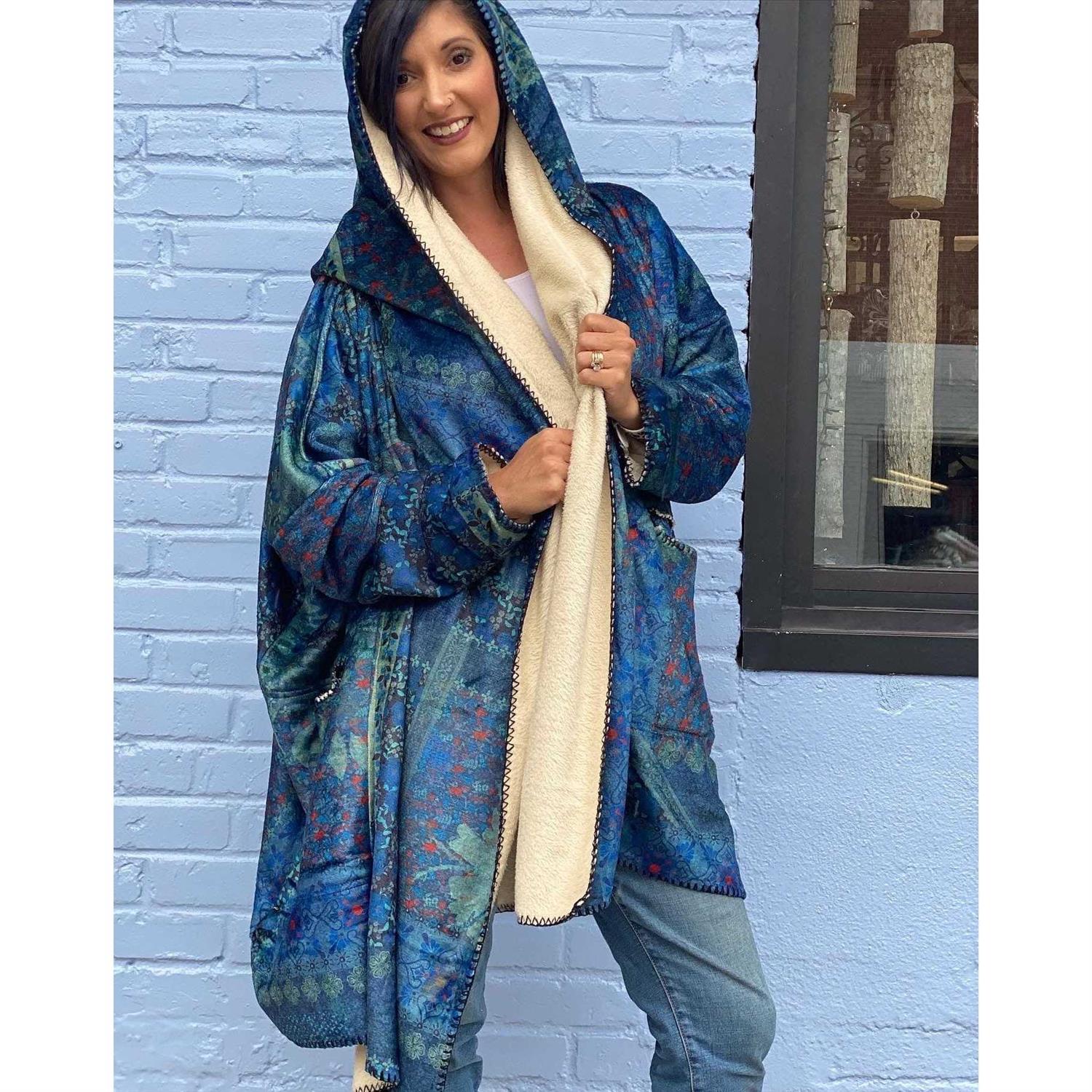 The great feel of the softest blanket except it doesn’t keep falling off your shoulders or struggle to wrap about yourself! choose from 3 colors and 2 lengths. Hint: they are happy at work or at games. Not just lounging. They love to be showed off! Wrap style, fleece-lined, pockets, and a hood!