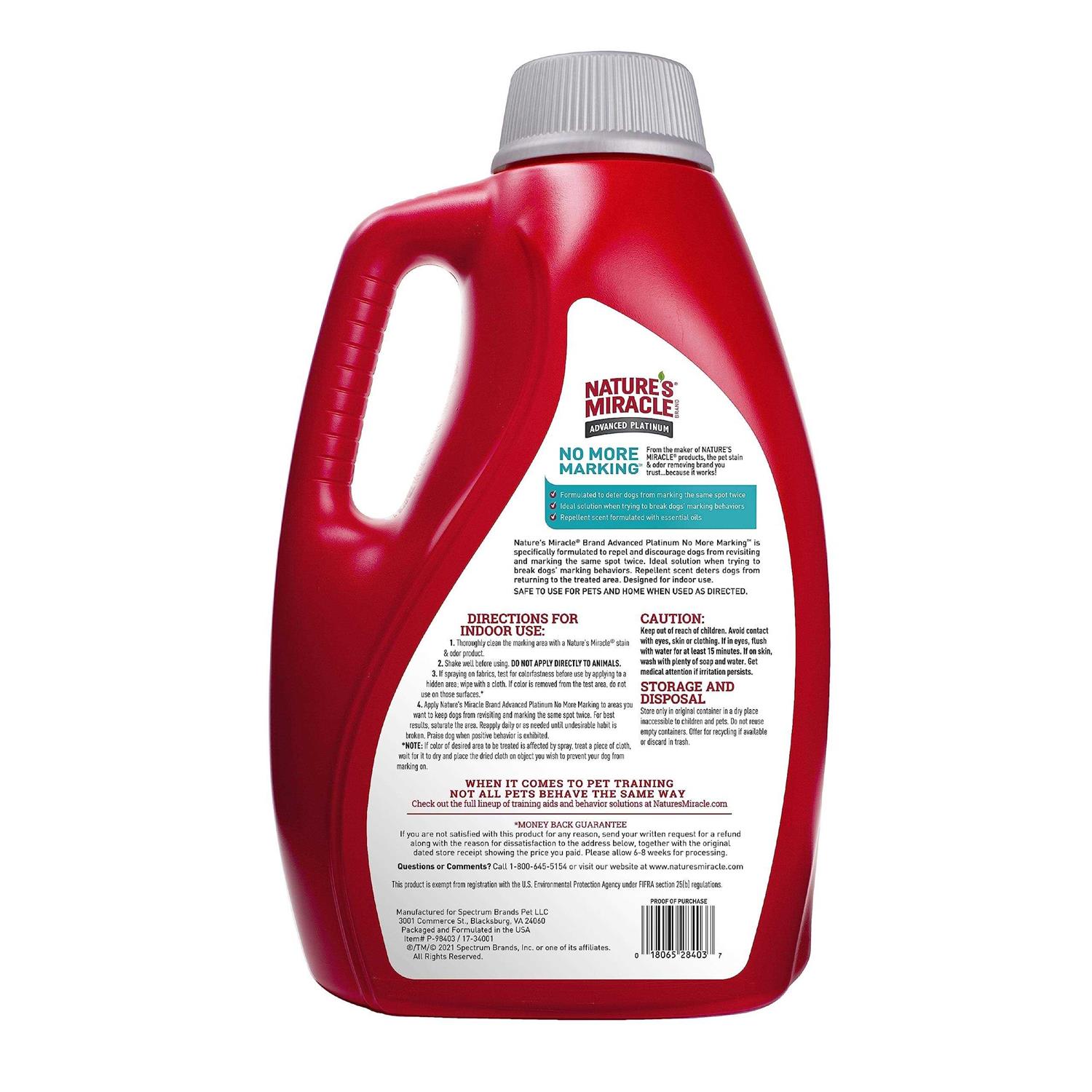 Bye-bye unpleasant odors! Our formula neutralizes odors, leaving your home smelling fresh and clean. Prevent future marking incidents with our specially formulated solution that discourages pets from re-marking their territory. Perfect for carpets, upholstery, clothing, and more. Use it wherever your pet’s marking mishaps occur. Tired of unsightly stains? Nature’s Miracle No More Marking effectively removes stains, restoring your surfaces to their original beauty. Gentle on pets, tough on stains. Our formula is safe for your furry friends and your home.
