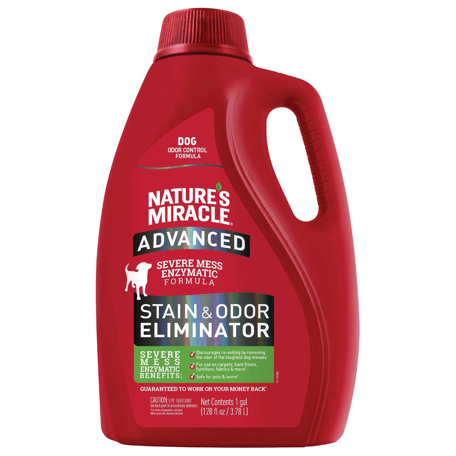 Nature’s Miracle pet stain and odor removers have been a trusted brand for pet mess cleanup for more than 35 years. Whatever pets do, you can Trust nature’s Miracle stain and odor removers, training aids, disinfectants and litter products to undo. Nature’s Miracle advanced stain and odor Eliminator is formulated the toughest dog messes and works to discourage re-soiling by removing the odor of dog messes. The bacteria-based formulas produce enzymes when they come into contact with a food source — pet urine, feces, vomit and other bio-based messes. The enzymatic cleaner will continue working as long as the food source is present. The stain and odor Eliminator is safe to use on carpets, hard floors, furniture, fabrics and more, when used as directed, and leaves you with a light fresh scent. Trust the Miracle when finding solutions for a clean home and a happy, healthy pet.