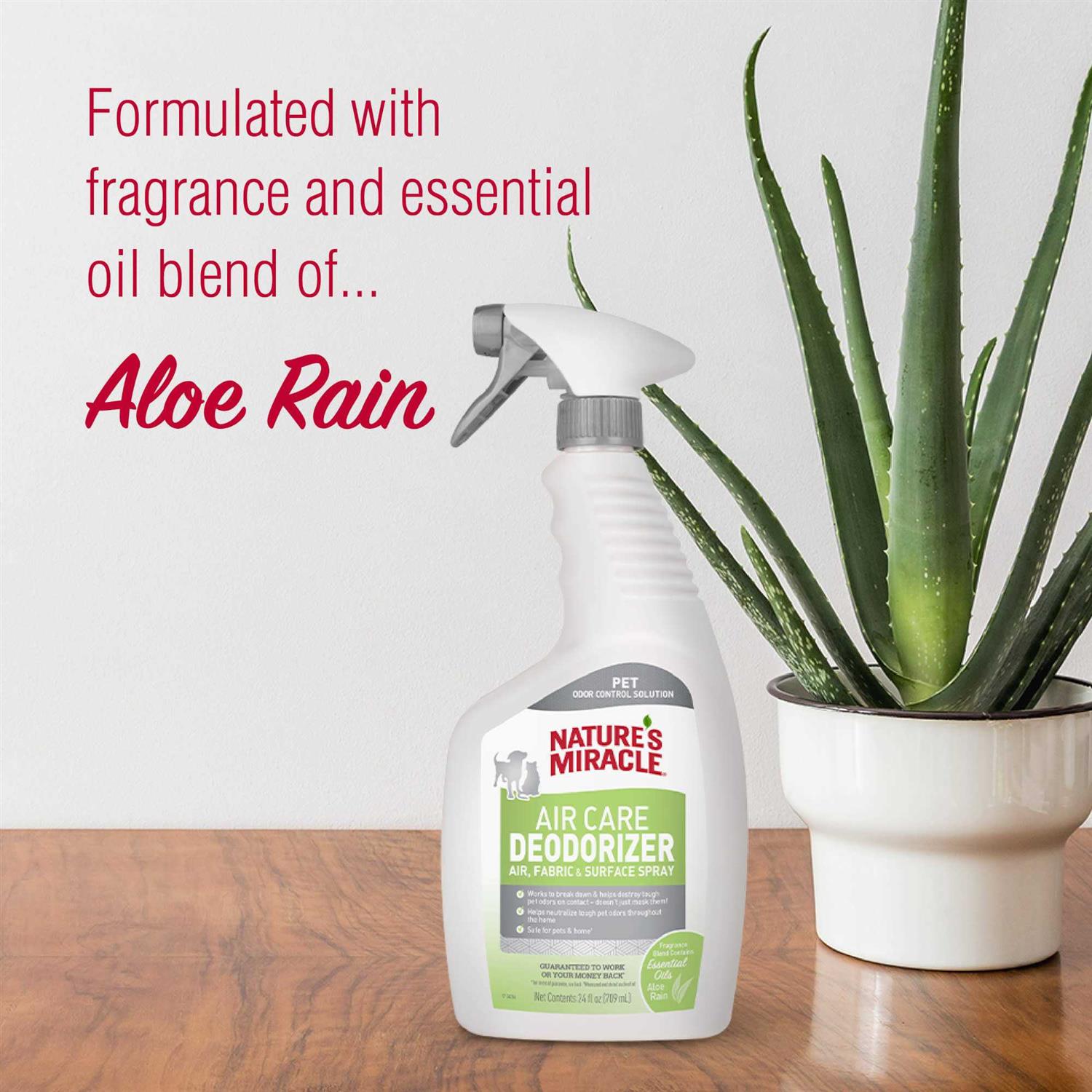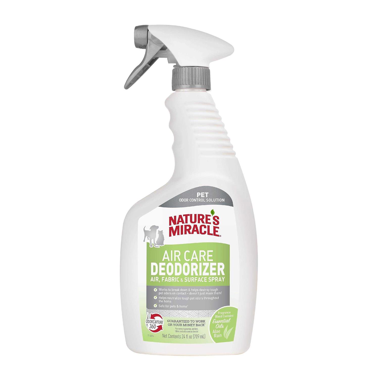 Deodorizers by Nature’s Miracle. Details:Life with pets can get a bit smelly. When it does, Nature’s Miracle Air Care Deodorizer is the ultimate pet odor eliminator for airborne, fabric and hard-surface odors. Unlike many products that may simply mask unpleasant pet odors, this pet odor controlling solution is formulated with OdorCapture 360 odor control technology and works to break down and help destroy tough pet odors on contact. Plus, it’s made with a fragrance blend containing essential oils to leave a pleasant aloe rain scent. Spray in the air or on surfaces to help neutralize pet odors on fabrics and hard surfaces, including carpet, hard floor, crates and more spaces throughout the home. Safe for pets and home when used and stored as directed.