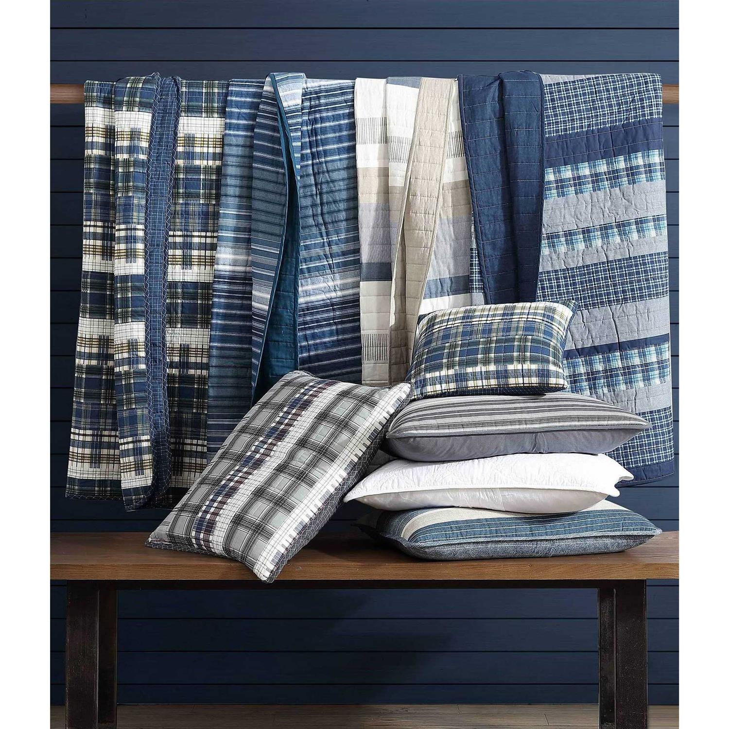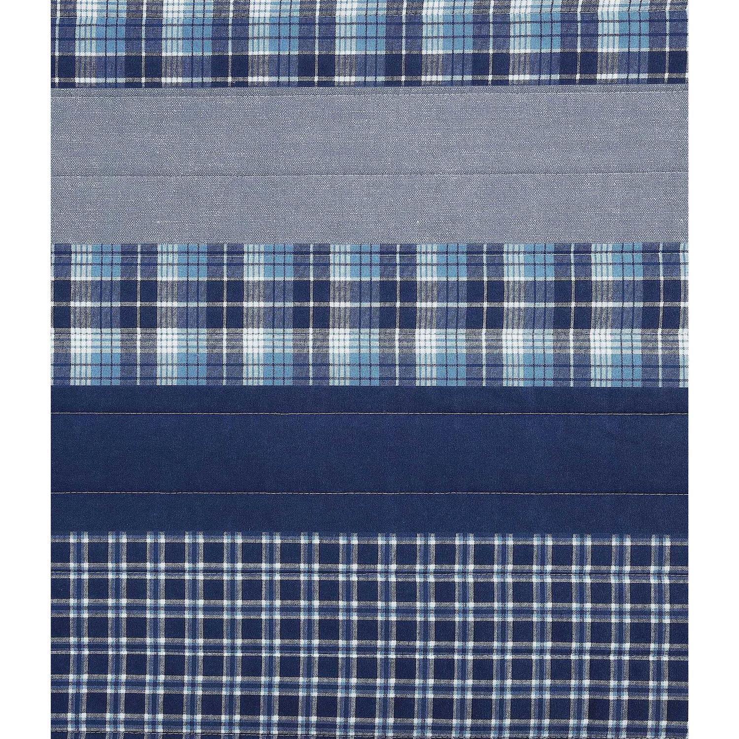 With a modern twist on a traditional style, Nautica’s Addison quilt set features a combination of navy tattersall plaids and a navy/blue plaid with wide bands of chambray solids in blue/grey and navy. It is designed to keep you cool in the breezy summer months and warm on those cold winter nights. Fully reversible, this set reverses to a solid navy ground for versatile bedroom looks. This quilt set is easy to maintain and machine washable for convenience. The rounded corner shams provide a soft sensibility that features the reverse print into the bound edges. The quilt is filled with a cotton/polyester blended fill that is crafted for durability.