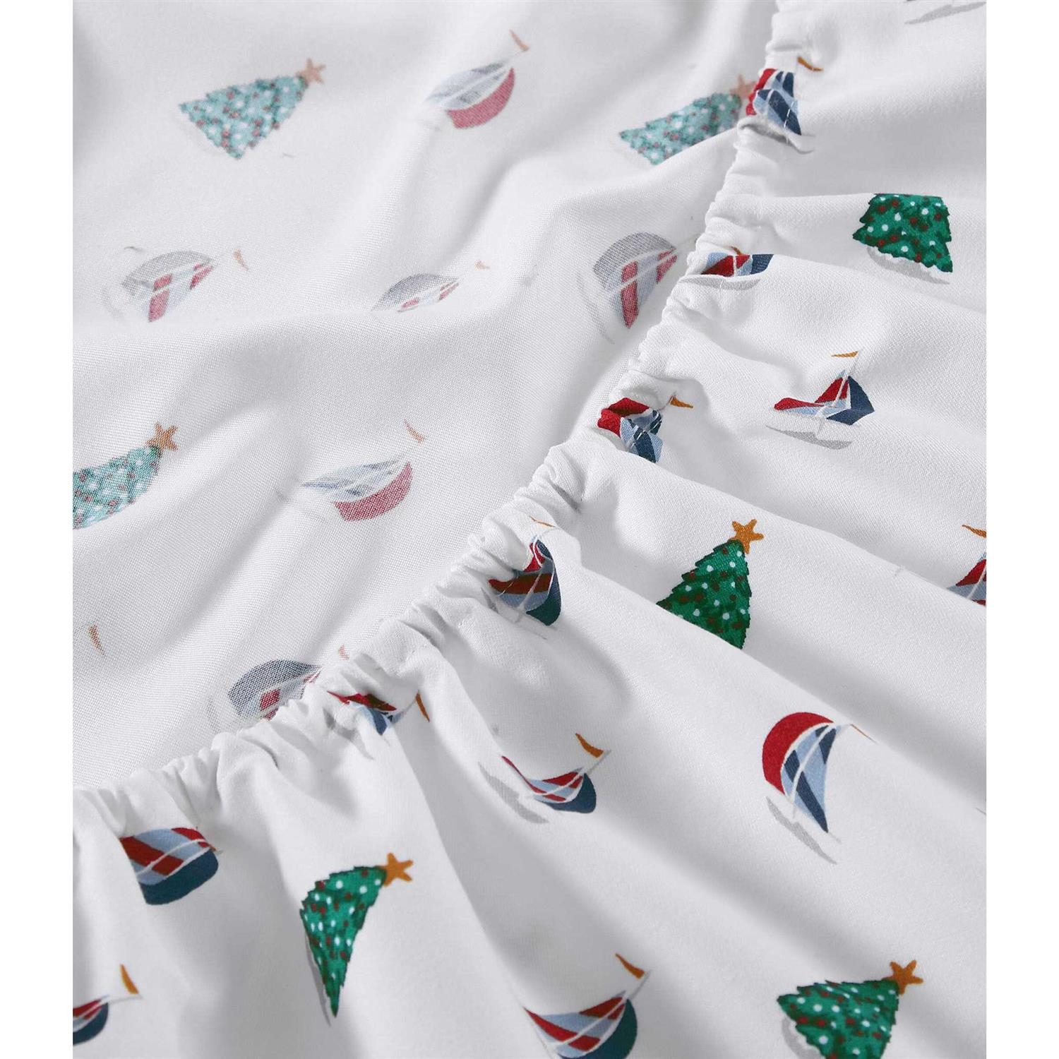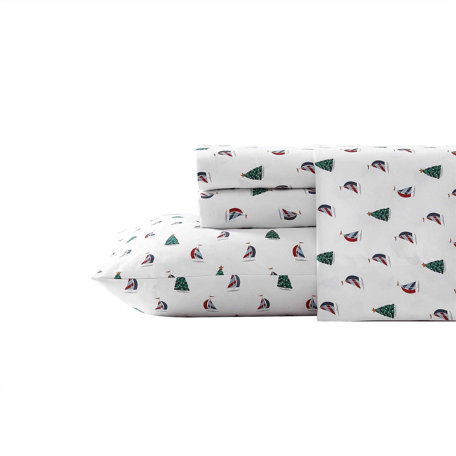 Cozy up each night with Nautica’s holiday sails flannel sheet set featuring red and blue sail boats with christmas trees in green scattered on a white ground. Made of flannel, these sheets are brushed 3 times for extra softness. Each set is equipped with a fully elastic fitted sheet to help ensure it doesn’t move throughout the night. Each set is sold with a flat, fitted, and 2 pillowcases. (1 pillowcase for twin size) deep pockets- 15 in. fitted sheet pocket depth (12 in. for twin size) and fits mattresses up to 18 in. (up to 15 in. for twin size) easy to care for sheet as they are all machine washable and get softer with each wash.