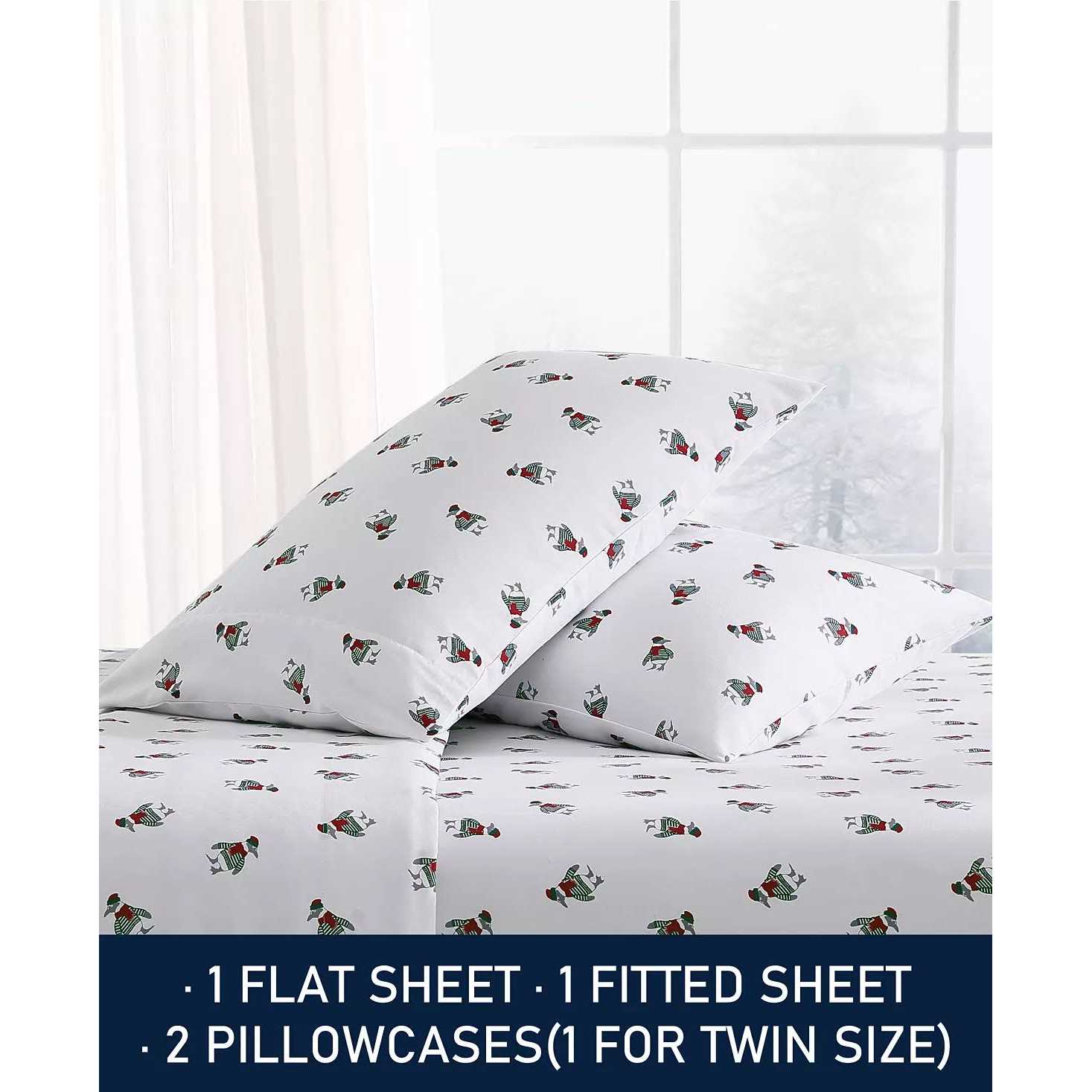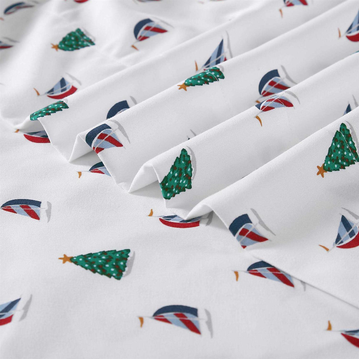 Cozy up each night with Nautica’s holiday sails flannel sheet set featuring red and blue sail boats with christmas trees in green scattered on a white ground. Made of flannel, these sheets are brushed 3 times for extra softness. Each set is equipped with a fully elastic fitted sheet to help ensure it doesn’t move throughout the night. Each set is sold with a flat, fitted, and 2 pillowcases. (1 pillowcase for twin size) deep pockets- 15 in. fitted sheet pocket depth (12 in. for twin size) and fits mattresses up to 18 in. (up to 15 in. for twin size) easy to care for sheet as they are all machine washable and get softer with each wash.