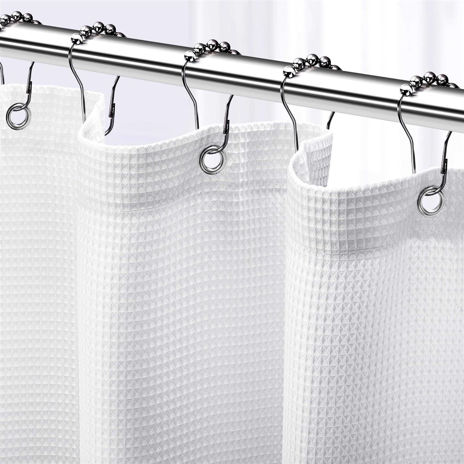 TECHNICAL SPECIFICATIONS: Our waffle shower curtain is designed to perfectly fit most standard shower areas, measuring 72 Inch wide x 72 inch long , offering superior durability and quality for your bathroom décor needs. HOTEL STYLE WAFFLE DESIGN: Immerse yourself in the refined feel of our waffle shower curtain, carefully crafted from a premium Polyester Fabric that features an exquisite waffle texture, adding a touch of elegance to your bathroom. WATER REPELLENT FUNCTIONALITY: Embrace the water-repellent feature of our fabric shower curtains for bathroom, ensuring a spotless and pristine appearance by effectively repelling moisture and water, leaving your bathroom, camper, RV, dorm, or anywhere you shower clean and dry HASSLE-FREE INSTALLATION: Experience effortless setup with our thoughtfully designed waffle shower curtain, equipped with 12 rust-resistant grommets that perfectly fit most standard shower hooks or rings, allowing you to hang up our curtain quickly and securely. Embrace peace of mind knowing that our team is ready to provide the support you need for a hassle-free experience.