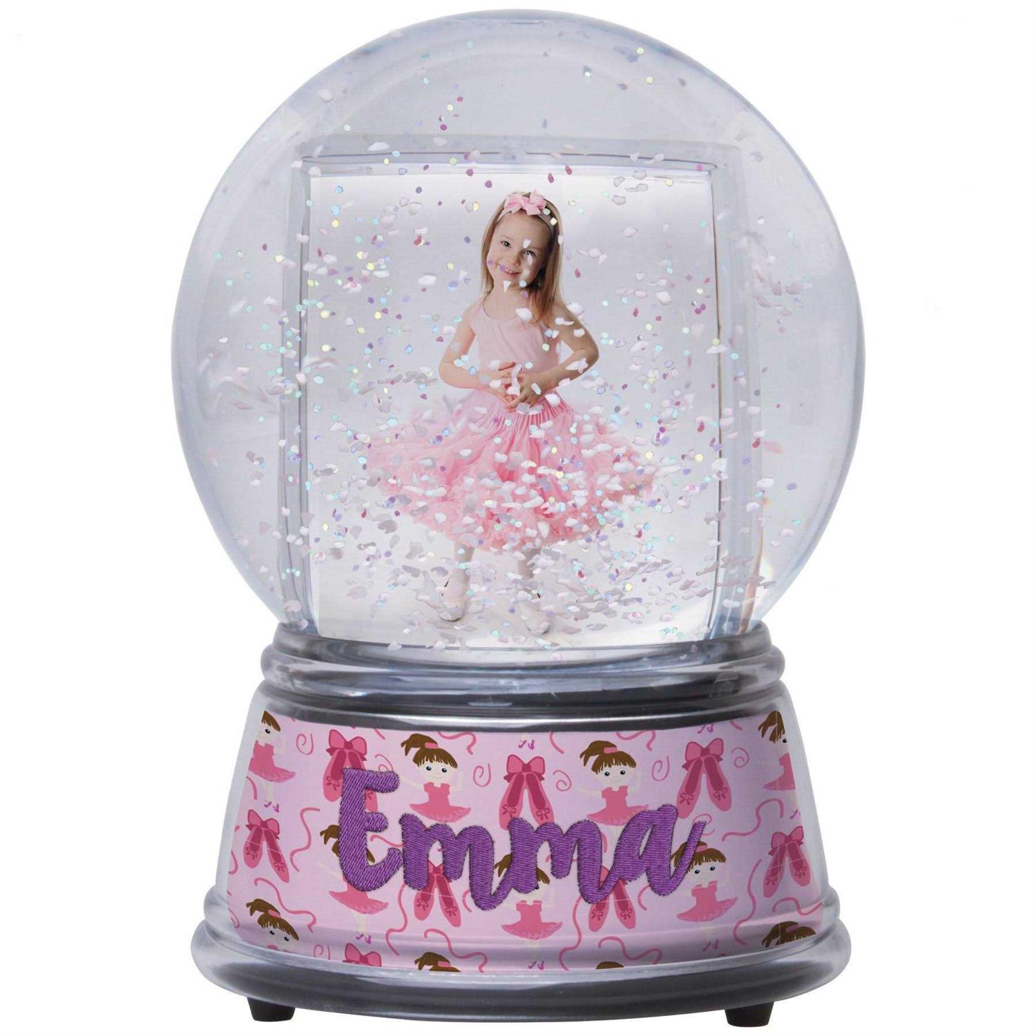 This do-it-yourself photo snow globe is the ultimate personalized gift. You can even design your own base! This photo snow globe has a 4” diameter base, and is approximately 6.25” in height. Each snow globe holds two 2” x 2.875” photos, which is a trimmed 2” x 3” insert. Photos are displayed on either side of the snow globe. As for the base, it can hold one 1.5” x 11” insert. Each individual snow globe includes 4 pre-printed inserts for the snow globe base. Use one of the pre-printed inserts as your base design, or use it as a sizing template to create your own unique, completely custom, base. The globe itself is made of a soft, pliable surface. It is not made of glass. The inside of the globe features white snow, and iridescent glitter that floats around when shaken. When the snow globe is on a surface, the snow and glitter will settle at the bottom. To personalize, remove the top globe from the bottom base. For the base insert, line up the three latches to remove the black bottom. Place your insert inside the base, and lock the bottom latches back into place. For the globe, place your photos inside the slit at the bottom of the globe. When your images are in place, set the globe back on top of the base. Then shake, and enjoy your custom globe!