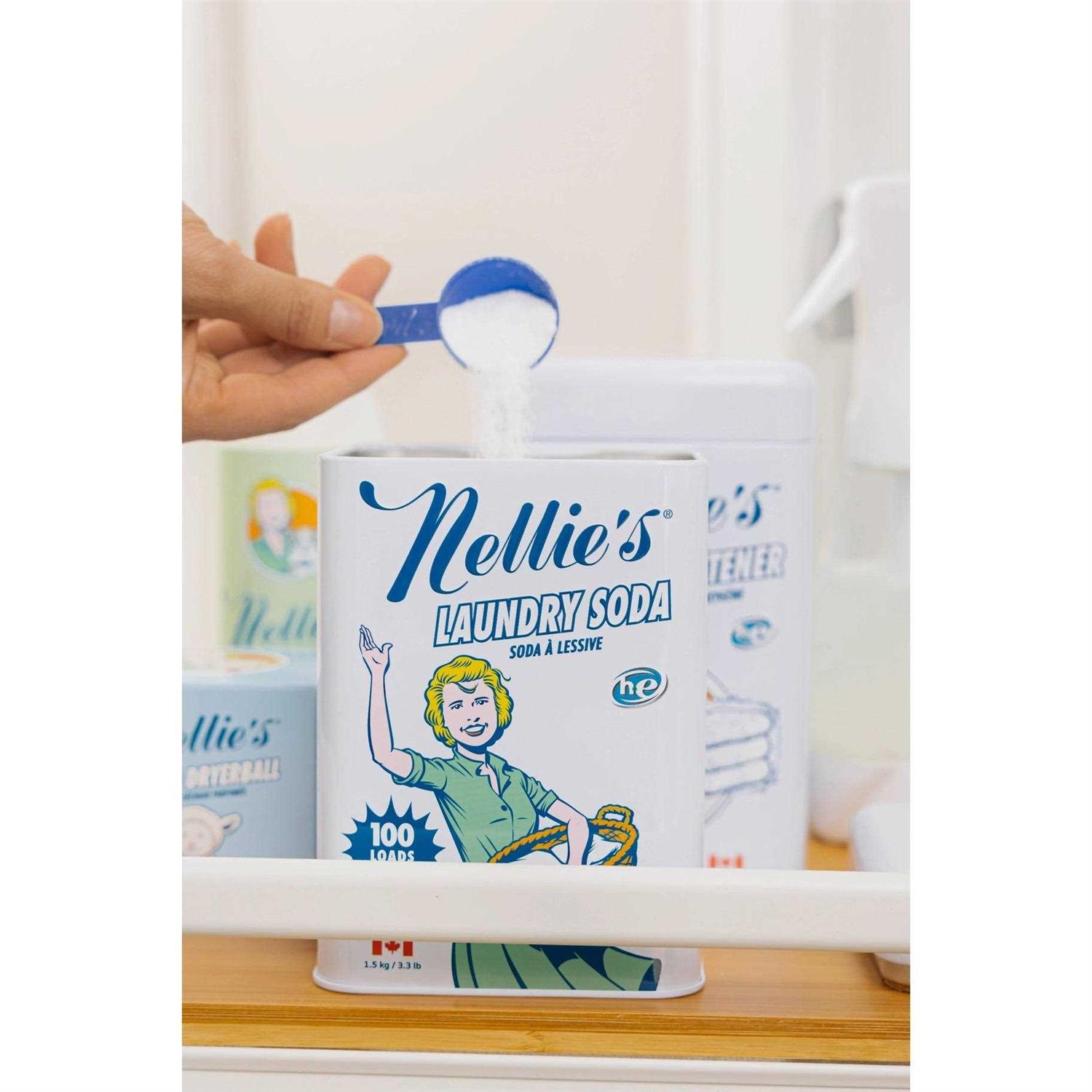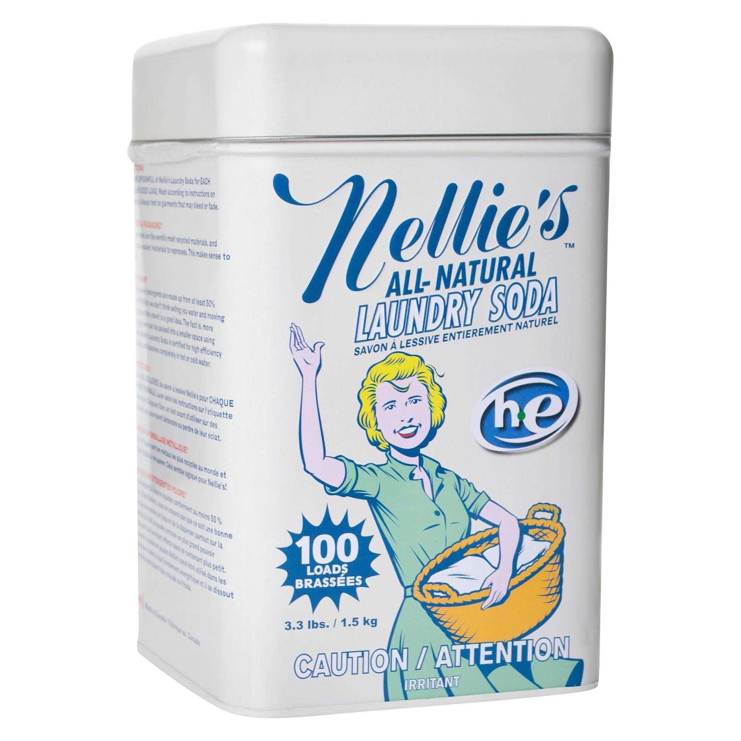 Nellie’s laundry soda dissolves quickly in cold or hot water, rinses thoroughly, leaves no residue that makes fabrics stiff and irritating, and is certified for high efficiency washing machines. This package contains 100 uses, on average, based on weight.