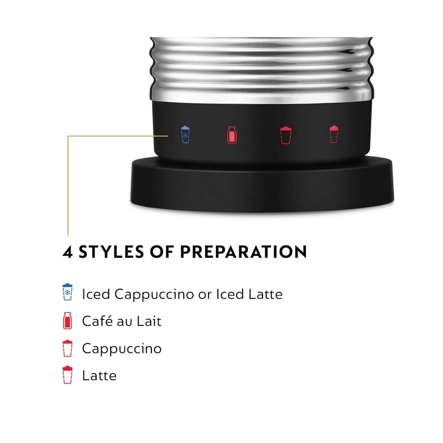 The ideal accompaniment to Nespresso espresso machines and perfect for coffee-drink lovers, this quiet and entirely automatic tool froths hot or cold milk to perfection every time, and it’s dishwasher safe for easy cleanup! Your favorite espresso drinks will taste richer and creamier, and all it takes is the push of a button. With a design that unites simple-to-use functions with elegant styling, the Aeroccino 4 comes with a whisk for hot milk and milk foam in many coffee-drink recipes. The Aero 4 fully froths cold milk in 60 seconds, and hot milk takes just ten seconds longer.