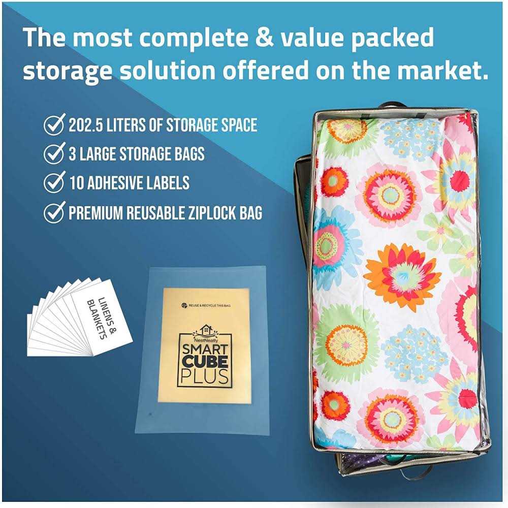 CUT THE CLUTTER – A home brimming with clothes, linens, toys, and more leads to disorganization and discomfort. Take your home from cluttered to clean when you organize with the SmartCubePlus underbed storage containers by Nest Neatly! WHAT’S INSIDE YOU’LL SEE – Never lose track of what you’re storing! You can see inside the under-bed organizers through their clear windows. Plus, they come with 10 adhesive tags that are perfect for labeling what’s inside. STORAGE THAT’S STURDY – Don’t settle for flimsy under-bed storage bins that break all too easily. Store items with confidence in the under-bed storage containers that feature durable #5 metal zippers, reinforced ”H” handles, and rip-resistant cloth. STORE EVEN MORE – Hide away thick comforters or heavy winter clothes in your BONUS Square Smart Cube that gives you 81 extra liters of storage space! Spacious and durable, the 23.6×17.7×11.8 in. storage cube is perfect for larger loads.