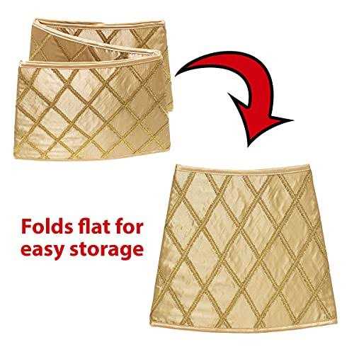 Your Christmas tree is trimmed, the lights are sparkling, everything looks perfect for Christmas morning photos… except for the sight of that clunky metal tree stand. Bring the magic of your holiday decorations all the way to the floor with the New Traditions Ivory Modern Ornaments Stand Band, a beautiful addition or alternative to a traditional Christmas tree skirt. This Christmas tree collar lets you hide unattractive tree bases and keep children and pets away from the tree bottom, but unlike a tree skirt, the xmas tree collar eliminates the need to use a steamer to remove wrinkles or worry about the material lying smoothly. Measuring 11” tall and with a 26” diameter base, this tree ring collar fits most tree stands for both natural and artificial Christmas trees. The stand band is made from an acrylic felt fabric imprinted with colorful mid-century modern ornaments in shades of red, green, pink, and blue, as well as green pine tree boughs, red strings, and silver snowflake accents. The base and top of the Christmas tree collar are trimmed with a solid red fabric edging to give it an elegant, finished look. The collapsible stand band is extremely easy to assemble – simply insert two plastic tubes through the elastic loops around the top and bottom of the tree collar and it’s ready to use. When it’s time to put away the holiday decorations, it easily disassembles and folds flat for storage. This New Traditions stand band makes a beautiful accessory for any natural or artificial Christmas tree.