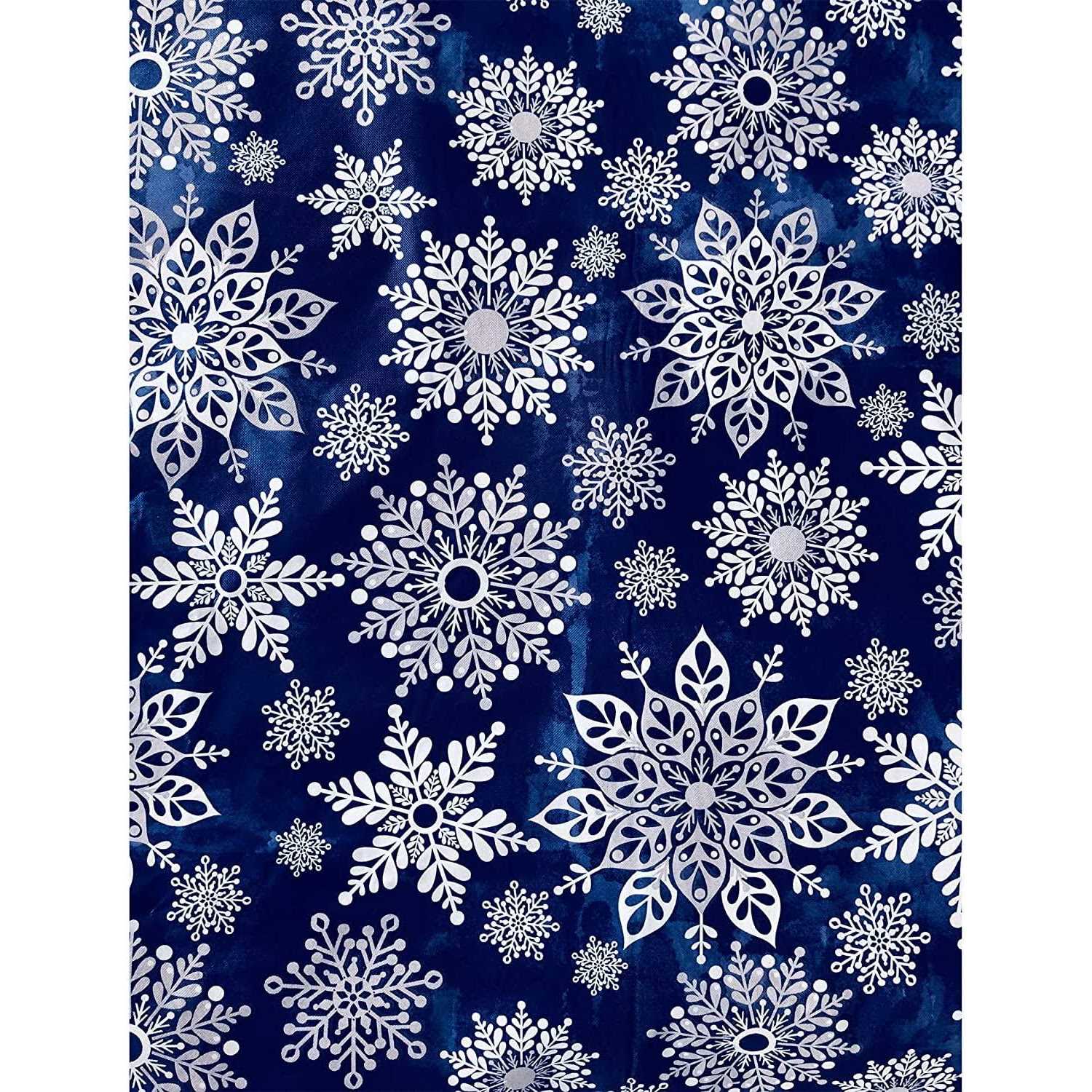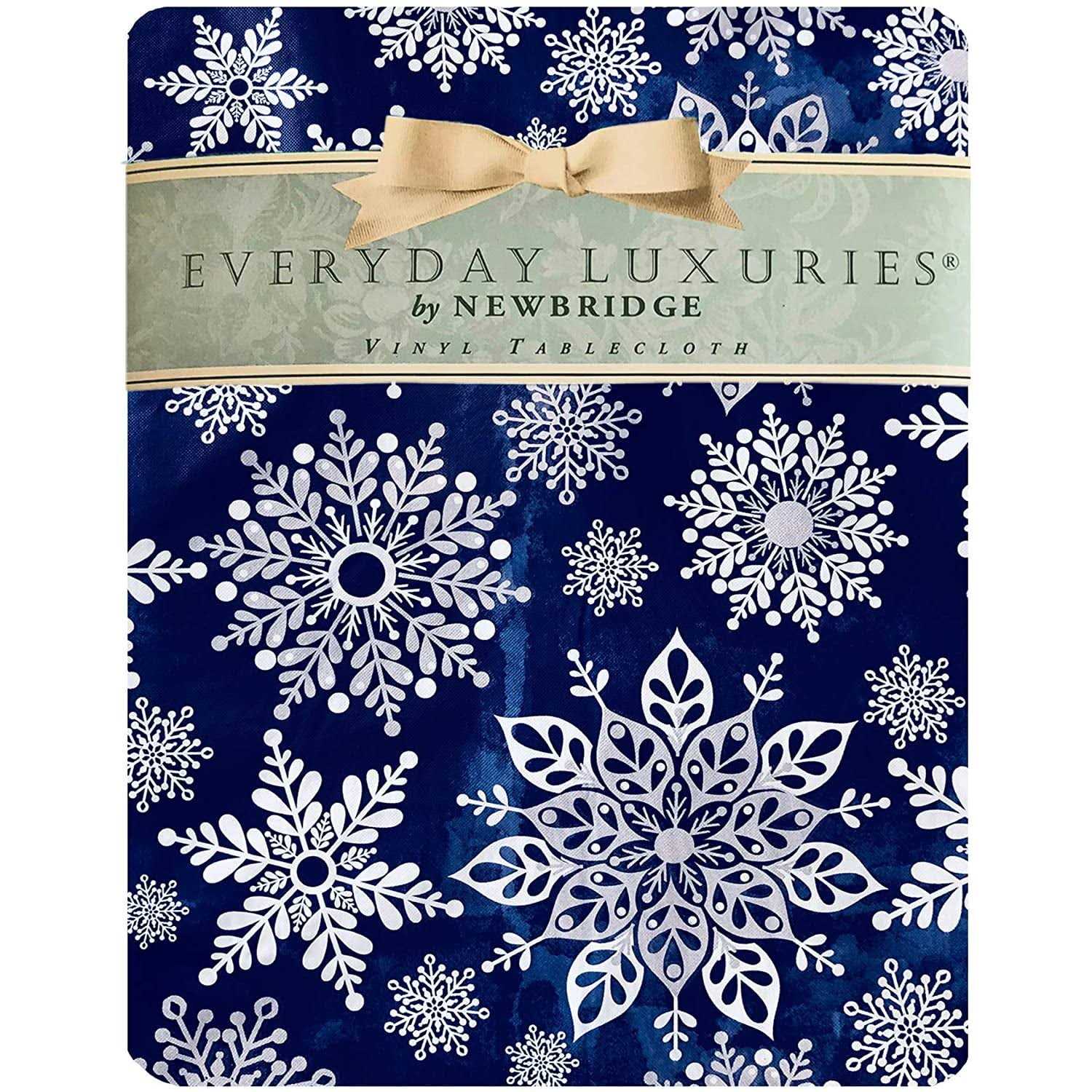 From the Winter Table Fashions Collection by Newbridge, the Navy Blue Winter Sparkle Snowflake Vinyl Flannel Backed Christmas Tablecloth pattern is suited to dining and entertaining throughout the holiday season. The Newbridge Navy Blue Winter Sparkle Snowflake Vinyl Flannel Backed Christmas Tablecloth print features an allover modern design of crystalized white and silver gray snowflakes of all shapes and patterns on a navy blue background. Great for use with adults and children for the entire Winter Holiday Season, Christmas and New Years at home or in commercial settings. Perfect for decorating and keeping your holiday XMAS table protected from everyday accidents. Like plastic, the easy-care vinyl surface is spill proof and can be wiped clean with a damp cloth or sponge. Vinyl top layer adds a protective waterproof layer. Flannel backed to reduce skidding and slipping on most surfaces. Finished with sewn edges. Easy to fold and store when not in use. Use these holiday tablecloths for kitchen and dining room tables either indoor, outdoor, home, restaurants, cafeterias and offices. Newbridge Navy Blue Winter Sparkle Snowflake Vinyl Flannel Backed Christmas Tablecloths are available in a large selection of sizes and shapes for all of your holiday entertaining needs. Sizes available are: 52 x 52 Square, 52 x 70 Oblong/Rectangle, 60 x 84 Oblong/Rectangle, 60 x 84 Oval, 60 x 102 Oblong/Rectangle, 60 x 120 Oblong/Rectangle, 60 x 144 Oblong/Rectangle and 70Round