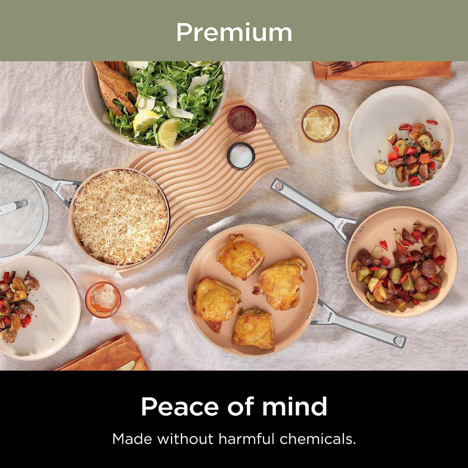 CERAMICLOCK COATING: Dual-bonded coating preserves nonstick performance for years while traditional ceramic cookware can wear out quickly. HEALTHY COOKING: Requires little to no oil or fat. PEACE OF MIND: Made without harmful chemicals, PFAS, PFOA, lead, or cadmium. PERFECT SEARING & EVEN COOKING: 4mm aluminum base evenly distributes heat for perfect results every time. DURABLE EXTERIOR: Hard-anodized exterior is easy to clean and maintain. OVEN SAFE TO 550°F: Easily go from stovetop to oven or broiler. All range capable. EASY CLEANUP: Durable coating easily wipes clean and is dishwasher safe. EASY TO USE: Metal utensil-safe and all range capable; compatible with gas, electric, glass ceramic, and induction stovetops. WHAT’S INCLUDED: 8″ Fry Pan, 9.5″ Fry Pan, 11″ Fry Pan, 1.5qt Saucepan with Lid, 2.5qt Saucepan with Lid, 6qt Stock Pot with Lid and User/Recipe Guide.