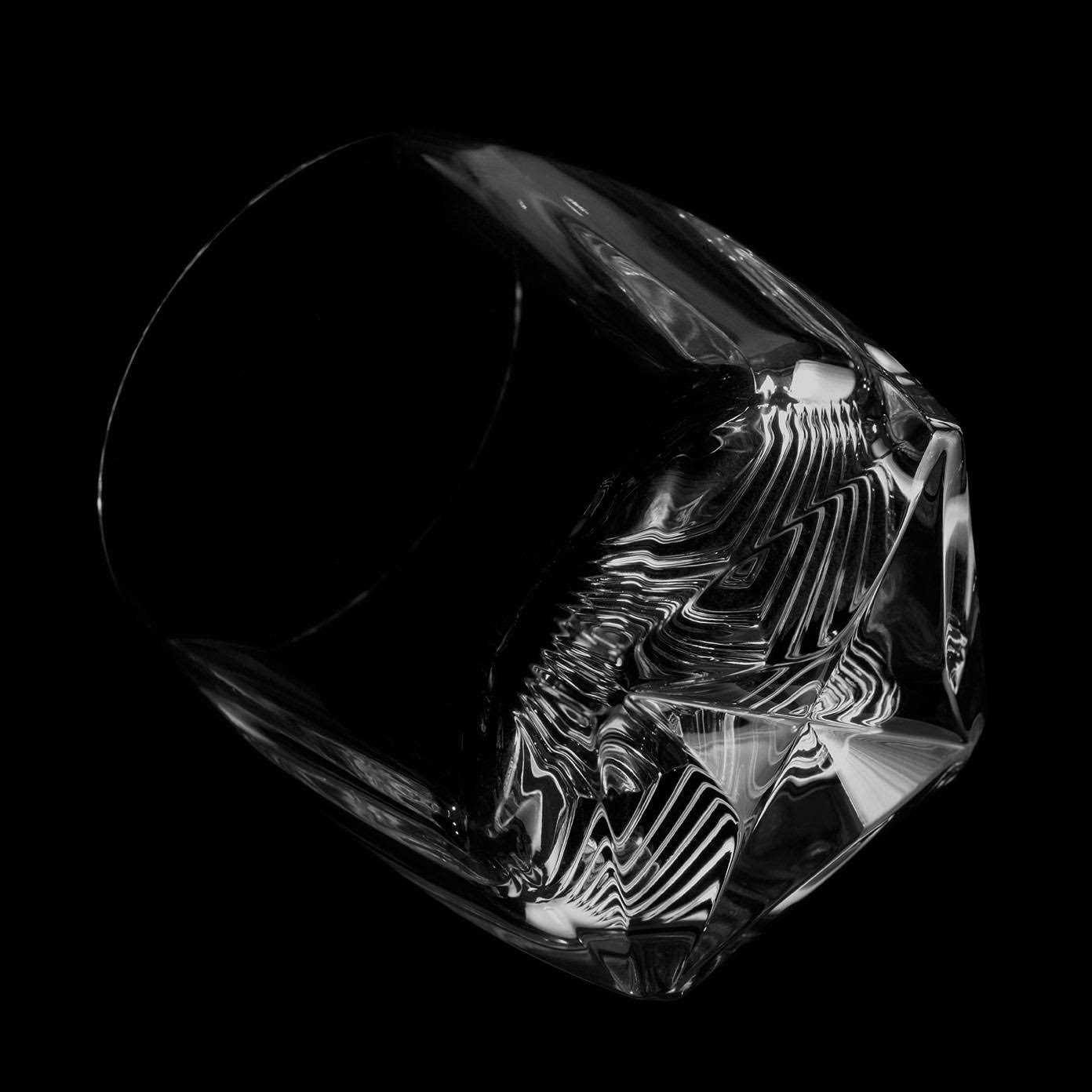 HEAVY tumbler perfect for those that like a weighted cocktail glass. DEVELOPED for whisky drinkers who prefer their spirit chilled or in a crafted cocktail CORE INNOVATION of an array of extruded chevrons radiating from the center of the inside of the glass, which serve to provide friction points for gripping ingredients used in muddled drinks. The Rauk Heavy Tumbler is the meeting point of advanced digital design, inventive production techniques and the intimate whisky ritual. The glass has been developed for whisky drinkers who prefer their spirit chilled, whether with an ice sphere or simply on the rocks. And for those who revel in the crafted cocktail, the tumbler features a core innovation. Inside the glass lies an array of extruded chevrons radiating from the center, which serve to provide friction points for gripping ingredients used in muddled drinks. Circumventing the ornamentation of traditional cut crystal, the entire surface of the tumbler, inside and out, is born in a single blinding moment of machine-pressing the molten crystal into a complex five-part mold. The result is a pure expression of material and form that somehow feels not of this time, with geometric facets and edges blending organically into curved surfaces that fascinate the eyes and play with the sense of touch.