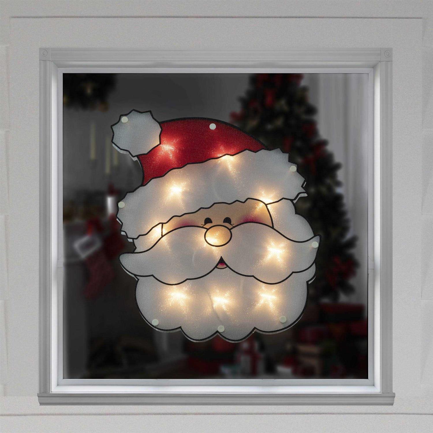 Light up your home this holiday season with this Santa Claus Christmas window silhouette. The perfect way to spruce up your decor with very little work. Product Features:. Color: clear bulbs / white wire. Number of bulbs: 10. Bulb size: mini. 24 in. white lead cord. 1-sided design. Durable and re-usable. Additional Product Features: Super bright bulbs. UL certified and approved for indoor use only. If 1-bulb burns out the rest will stay lit. Comes with replacement bulbs spare fuses and a suction cup for mounting the decoration. Contains 1 plug with end connector which allows you to stack multiple lighted items together (not to exceed 210-Watt). Wire gauge: 22. Dimensions: 12 in. H x 10 in. W x 1 in. D. Material(s): plastic/wire/glass bulbs.