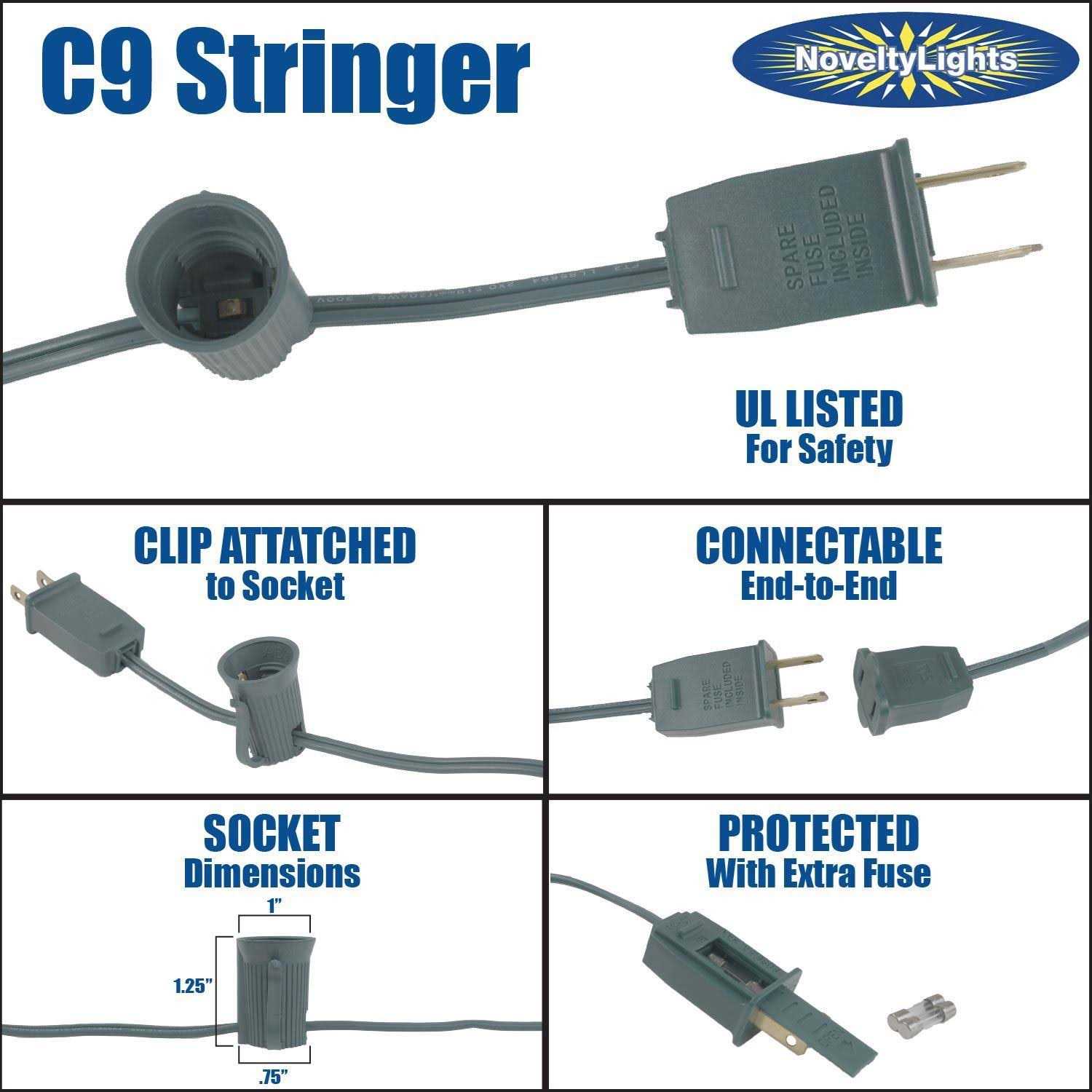 Novelty Lights SPT-1 wire stringer (e17) intermediate base for incandescent and C9 LED bulbs is perfect for creating your stunning holiday lighting extravaganza. Our C9 strings can be used indoors and outdoors for lighting up your roofline, fenceline, trees, and windows. Our C9 strings are made with 25 high quality sockets with each having a 6″ lead/tail wires. Each string comes with a 5 amp fuse with 1 extra fuse included inside the male plug. Bulbs are sold separately.