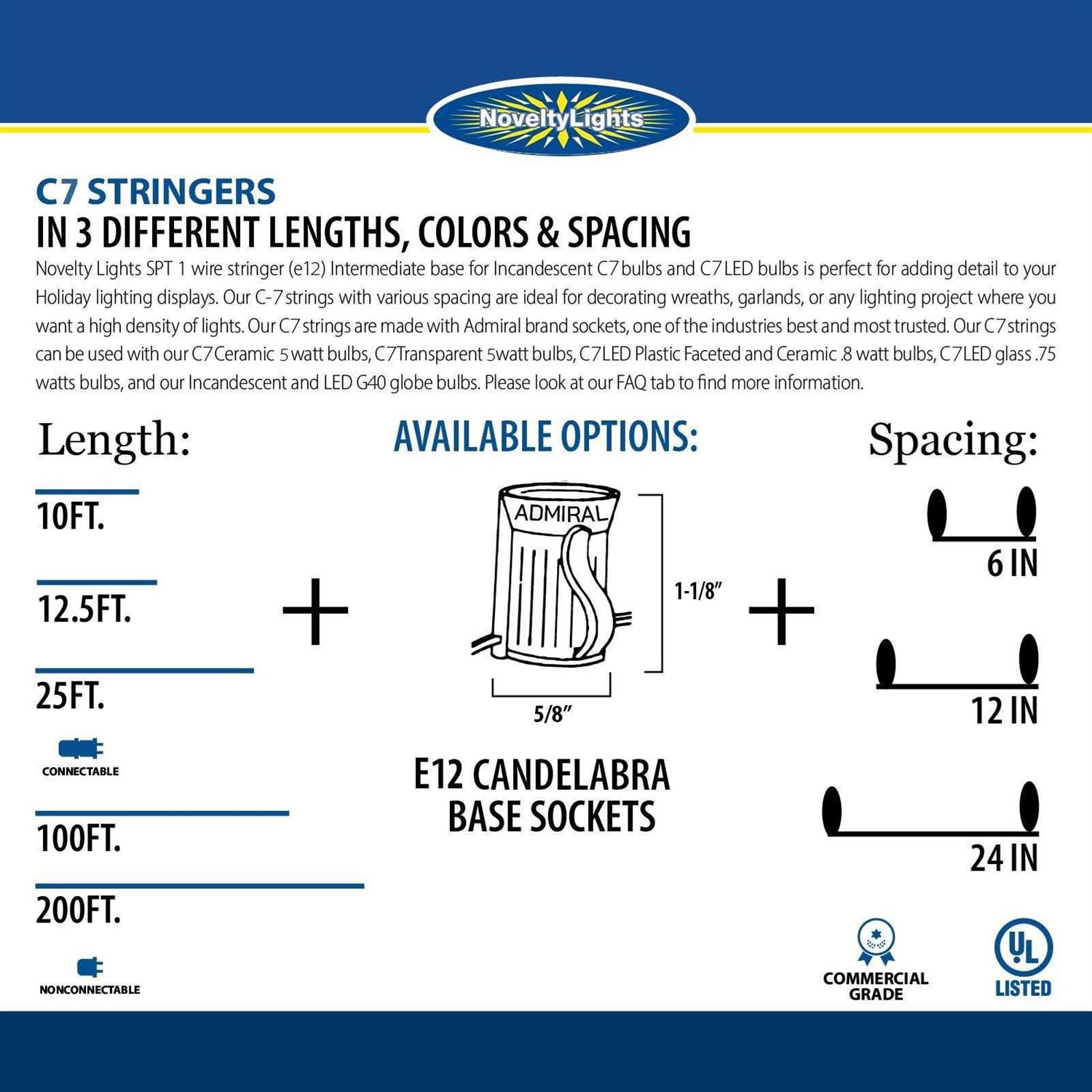 Novelty Lights 10-foot green wire stringer (E12) candelabra base for incandescent and C7 LED bulbs is perfect for creating your stunning holiday lighting extravaganza. Our C7 strings can be used indoors and outdoors for lighting up your roofline, fenceline, trees, and windows. Our C7 strings are made with 10 high quality sockets with each spaced 12” apart and 6″ lead/tail wires. Each string comes with a 5 amp fuse with 1 extra fuse included inside the male plug. Bulbs are sold separately.
