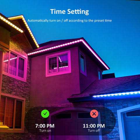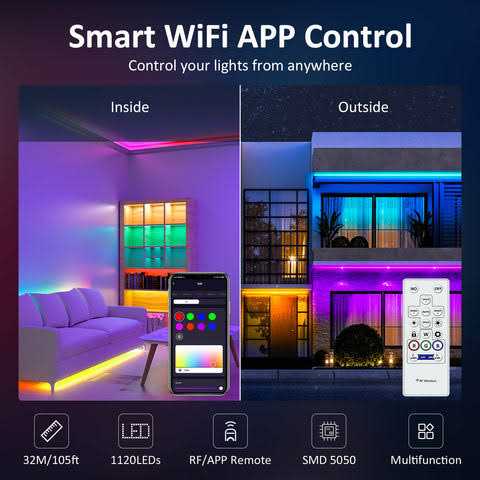 Novostella Play-Rainbow Outdoor 105ft 32M IP65 WiFi Smart Strip Lights Rope Lights 【DIY】 You can program your own patterns through the APP. you can design your own lighting effects according to your own ideas. Suitable for Holiday and Festivals, Halloween, Thanksgiving, Independence Day and Christmas 【New Music Mode】With 9 dynamic rainbow-effect music modes, it no longer flashes monochrome, making you feel every beat like never before. 【Safety & Waterproof】 Use 24V low voltage as working voltage, protect the safety of children and adults, with ETL safety certification. The outside strip IP65 waterproof protective case, which can effectively protect the chip and extend the service life. All parts, including power supply, are waterproof. 【App & Voice & Remote Control】 The light string is linked to the network via 2.4Ghz WiFi, APP control allows for more operations, remote control is simple and stable, and voice control is more convenient. 【Complete accessories】 Provide a complete set of accessories for installation, such as buckles, cable ties, glue, etc. Note: Glue should be used to repair after cutting, otherwise it will damage the waterproof property. Don’t cut it unless you have to.