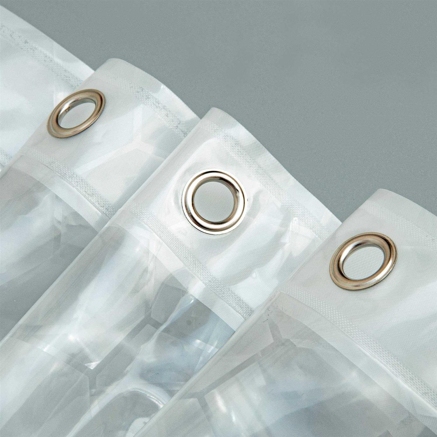 Latitude Run Our shower curtain is made of 6 Gauge Fernley, and compared with traditional PVC materials, they are healthier. There are 3 heavy-duty magnets at the bottom of our shower curtain to keep the liner in place and keep the cold air out. The clear shower curtain provides 12 sturdy rust-resisting metal grommet holes to accommodate the shower curtain hooks or other decorative hooks. This waterproof shower curtain is specially designed for the wet environment of the bathroom and shower, which can keep your bathroom away from moisture. This shower curtain is ideal for bathroom showers and bathtubs for your home, campers, hotels, and dorms, and creates a healthier bathroom environment for you, your kids, and your entire family.