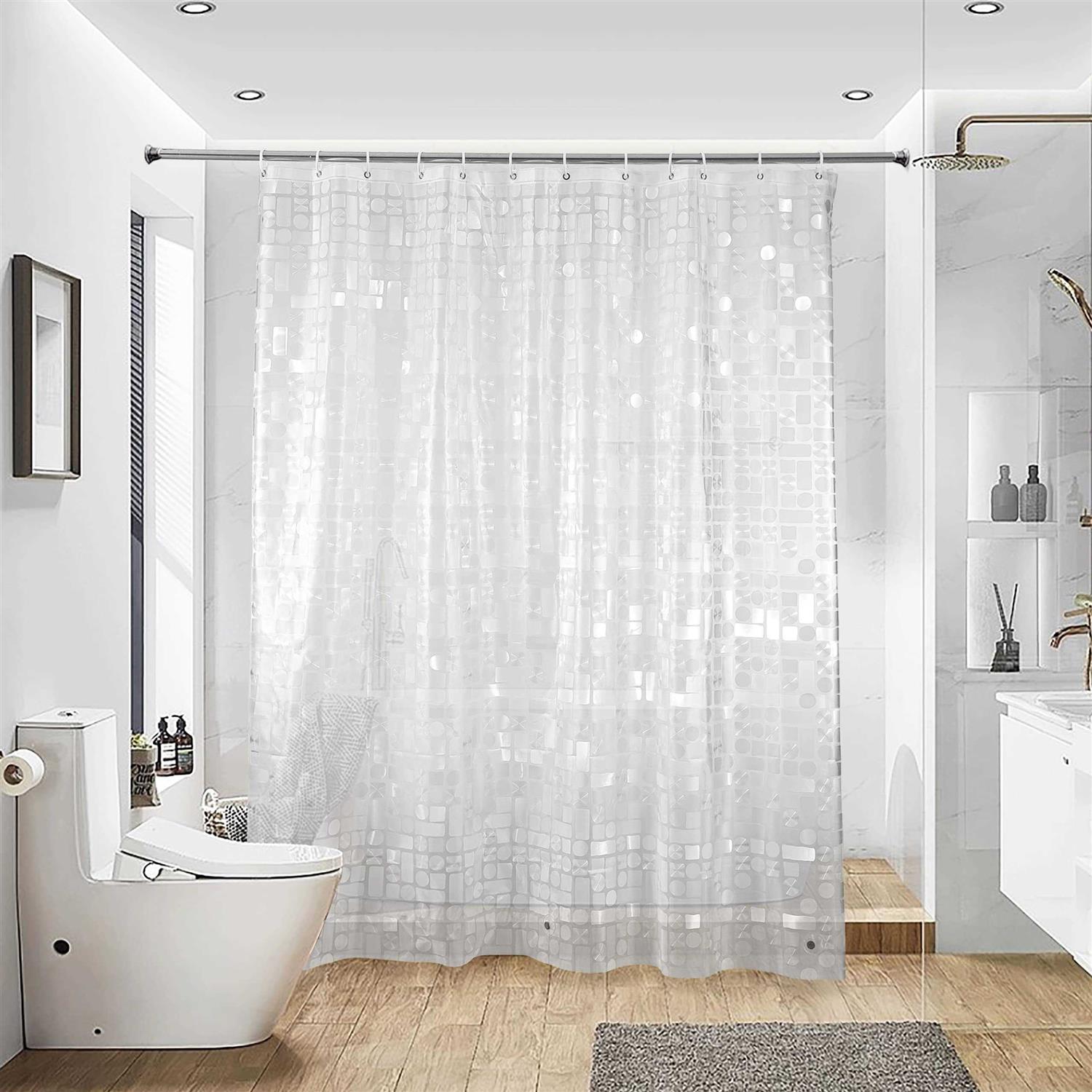 PACKAGE INCLUDES: 1 Shower Curtain (72 x 72 Inches) + 3 Weighted Magnets + 12 Plastic Hooks PRODUCT FEATURES: Our shower curtain is made of 6 Gauge EVA, compared with traditional PVC materials, they are healthier. There are 3 heavy duty magnets at the bottom of our shower curtain to keep the liner in place and keep the cold air out. The clear shower curtain provides 12 sturdy rust-resistant metal grommet holes to accommodate the shower curtain hooks, or other decorative hooks. PRODUCT FUNCTION: This waterproof shower curtain is specially designed to with moisture-rich bathroom and shower environments, which can keep your bathroom away from moisture. This shower curtain is ideal for bathroom showers and bathtubs for your home, campers, hotels, dorms, and creates a healthier bathroom environment for you, your kids and your entire family. EASY TO CARE: Do not need special care required, just maintenance through basic wiping and rinsing, your shower curtain will be free of any unhealthy conditions. For best results, open fully after each use to air dry. Specification: 72 x 72 inches Set Including: 1 Shower Curtain (72 x 72 Inches) + 3 Weighted Hems + 12 Plastic Hooks