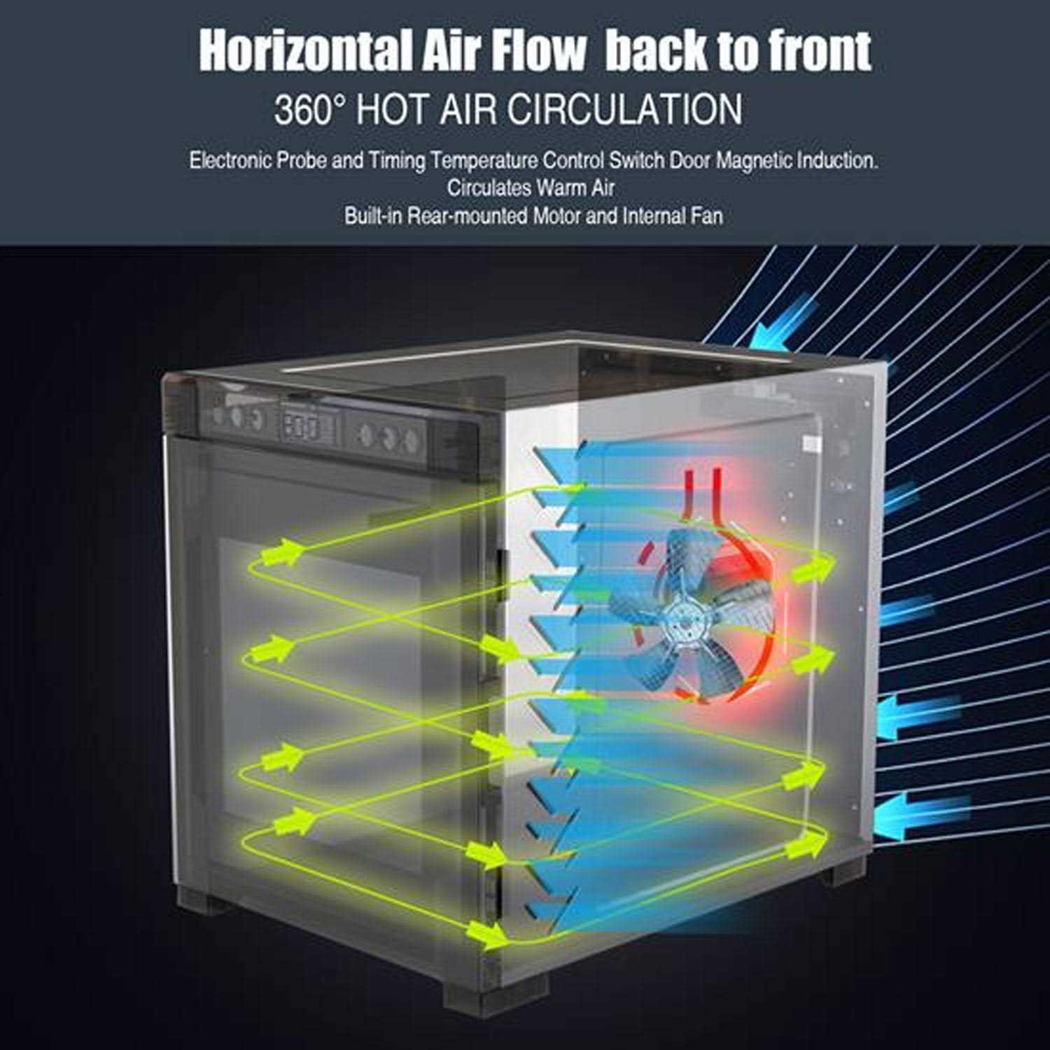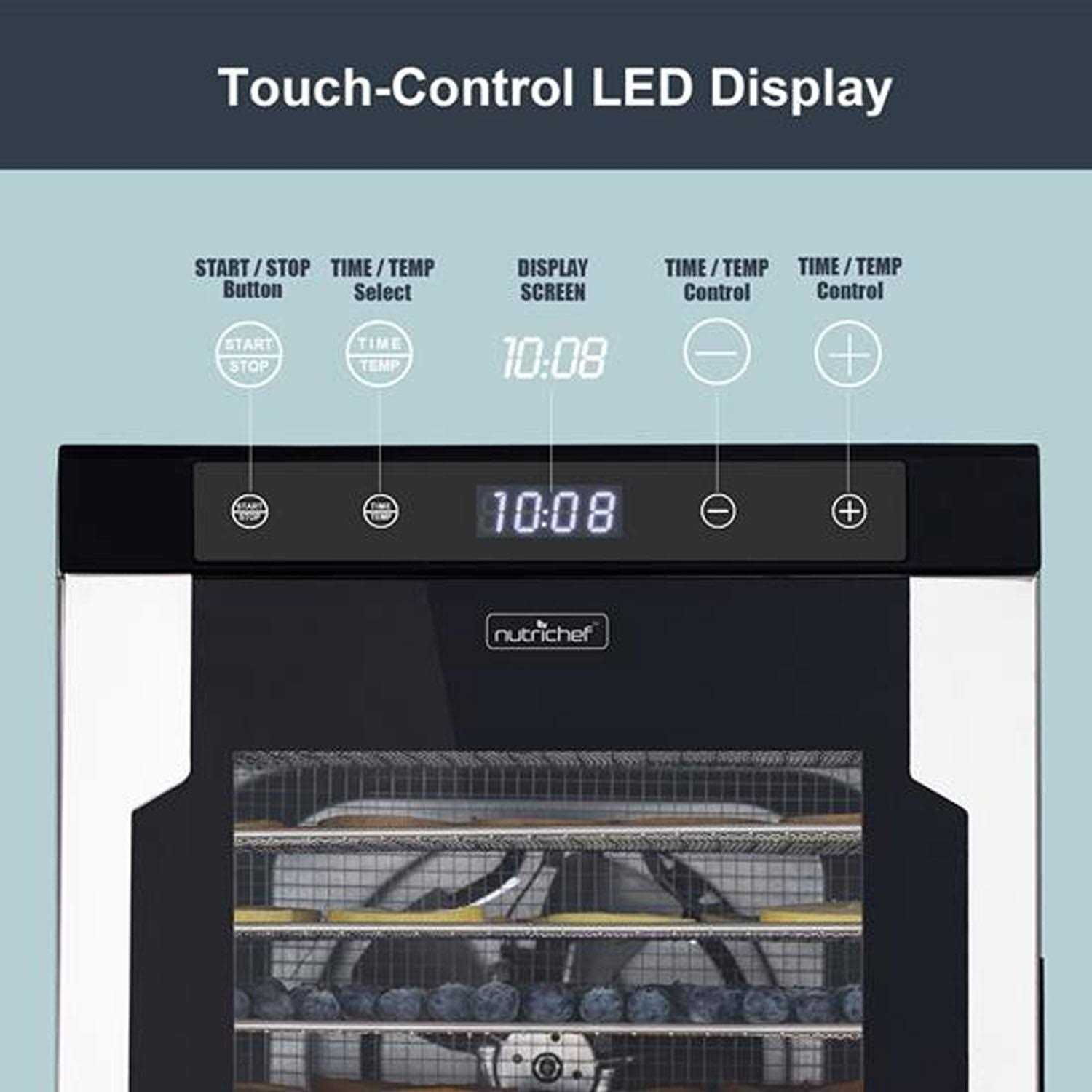Create delectable treats and preserve food for the long haul with the NutriChef 10 Shelf 900W Kitchen Countertop Food Dehydrator. This multi-tier electric dehydrator features 10 stainless steel living drawers, maximizing the usable space and pairing with the 360-degree circulating fan to ensure you have as much jerky, dried fruit, and veggie chips as you desire. The digital control panel lets you make incremental adjustments for specific recipes. A programmable timer and overheat protection lets you adjust the settings and get on with your day as your food dries out. Included with the kitchen countertop dehydrator is a mesh screen and a fruit roll sheet, along with a recipe book with 50 recipes to get you started cooking. The door features a magnetic latch to keep the heat inside and features a transparent panel, letting you keep an eye on your goodies as they dehydrate. Make the most out of every meal with the NutriChef 10 Shelf 900W Kitchen Countertop Food Dehydrator.