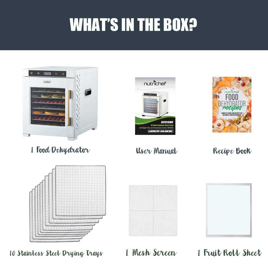 Premium Machine-900 Watts 10 Shelf Stainless Steel Dehydrator with Digital Timer and Temperature, Touch-Control LED Display, Perfect Way to Preserve Foods and More 10-LAYER FOOD DEHYDRATOR: With a large capacity of 10 trays and the ability to dehydrate up to 36.8 lbs of food at once NutriChef’s 10 layer dehydrator also have a 360° hot circulation, ensuring proper food preservation! Also easy to store & clean EASY ACCESS AND OPERATION: Built with easy to use touch-control LED display. Choose to dehydrate with just a click. It also has a temperature control system with a maximum of 170°F, making it as your ideal food preserver machine PRESERVE YOUR FOODS: Equipped with a built in rear-mounted motor and internal fan, this dehydrator is a perfect way to preserve food, snacks, vegetables, and more! Also has an adjustable time & temperature that automatically shuts off when done STACKABLE TRAYS AND COOKING BOOK: The food dehydrator comes with 10 stackable trays and a free recipe book with 50 original recipes! The dehydrator has an electronic probe & timing temperature control together with the switch door magnetic induction MADE WITH PREMIUM MATERIALS: Made with food-grade stainless steel and glass front door, this food dehydrator ensures long lasting use! The transparent door allows you to easily monitor your food, also dishwasher safe that includes overheat protection Features: Food-grade Stainless Steel and Glass Front Door 10-layer Living Drawer (13″ x 12″) Electronic Probe and Timing Temperature Control 360° Hot Air Circulation Large Capacity with 10 Trays and Up to 13 lbs. of Food Dehydrate at once Switch Door Magnetic Induction Built-in Rear-mounted Motor and Internal Fan Circulates Warm Air Easy to Store and Clean Safe and Quiet to Use Touch-Control LED Display Dishwasher Safe Automatic Shut Off Memory Function Includes Overheat Protection Included Mesh Screen & Fruit Roll Sheet Free Recipe Book with 50 Original Recipes Adjustable Time and Temperature Perfect Way to Preserve Fruit, Snacks, Vegetables, Bread, Flowers, and more Automatic Shut off when Timer is Done Transparent Door allows you to Easy Monitor Air Flow: Horizontal (back to front) What’s in the Box: (1) White Painting Food Dehydrator (1) Included Mesh Screen (1) Fruit Roll Sheet (10) Trays Technical Specs: Power Button: START/STOP Light Up, Screen shows 00:00 Temperature Setting: 170°F Temperature increment/Decrement: 5°F Construction Material: Stainless Steel Power Supply: AC 120V, 50Hz Power Output: 900Watts Time Range: 30 mins. – 24 hrs. Temperature Range: 95°F–170°F (35°C–76°C) Product Dimension: 13.38” x 19.02” x 16.58” -inches Product Manual NCFD10WH