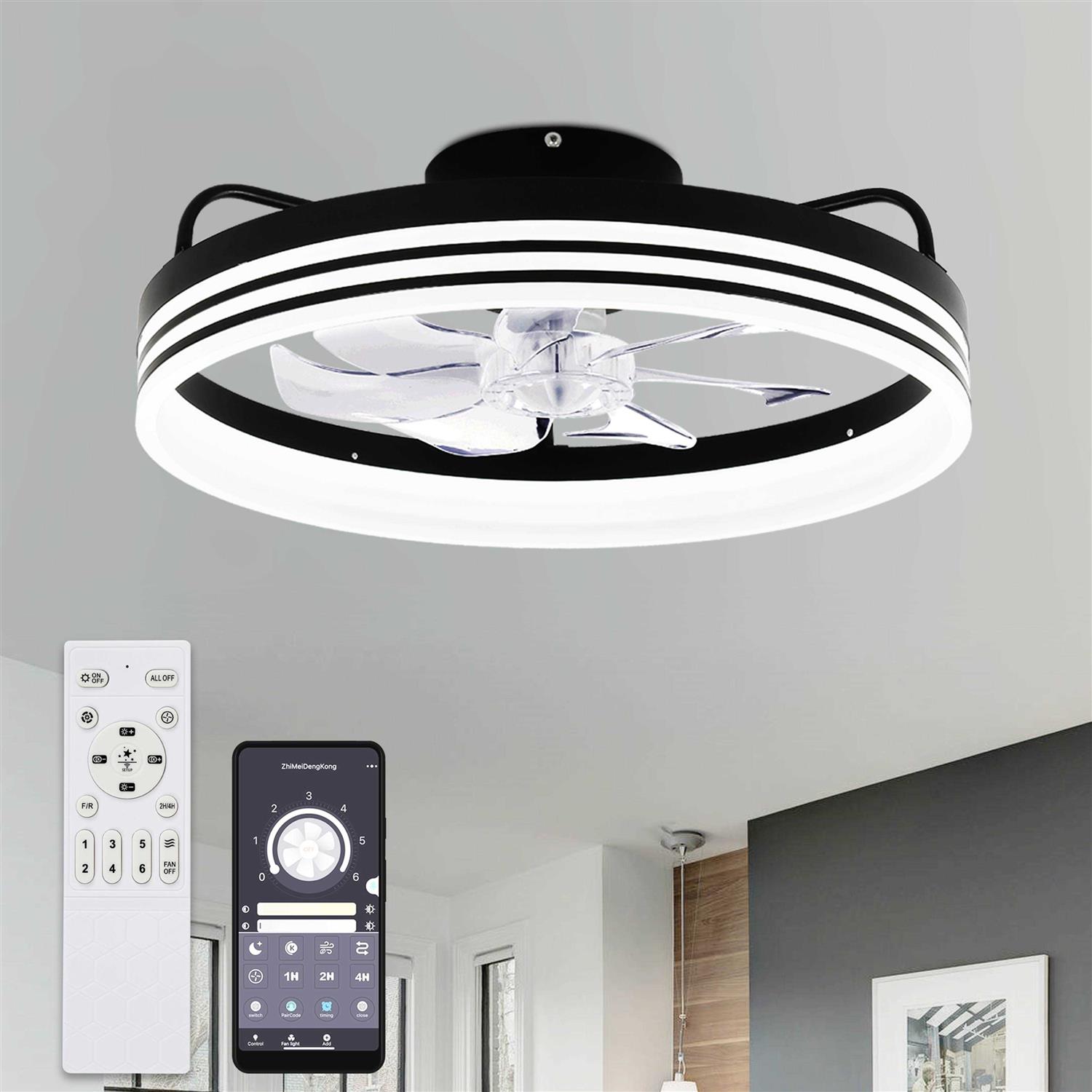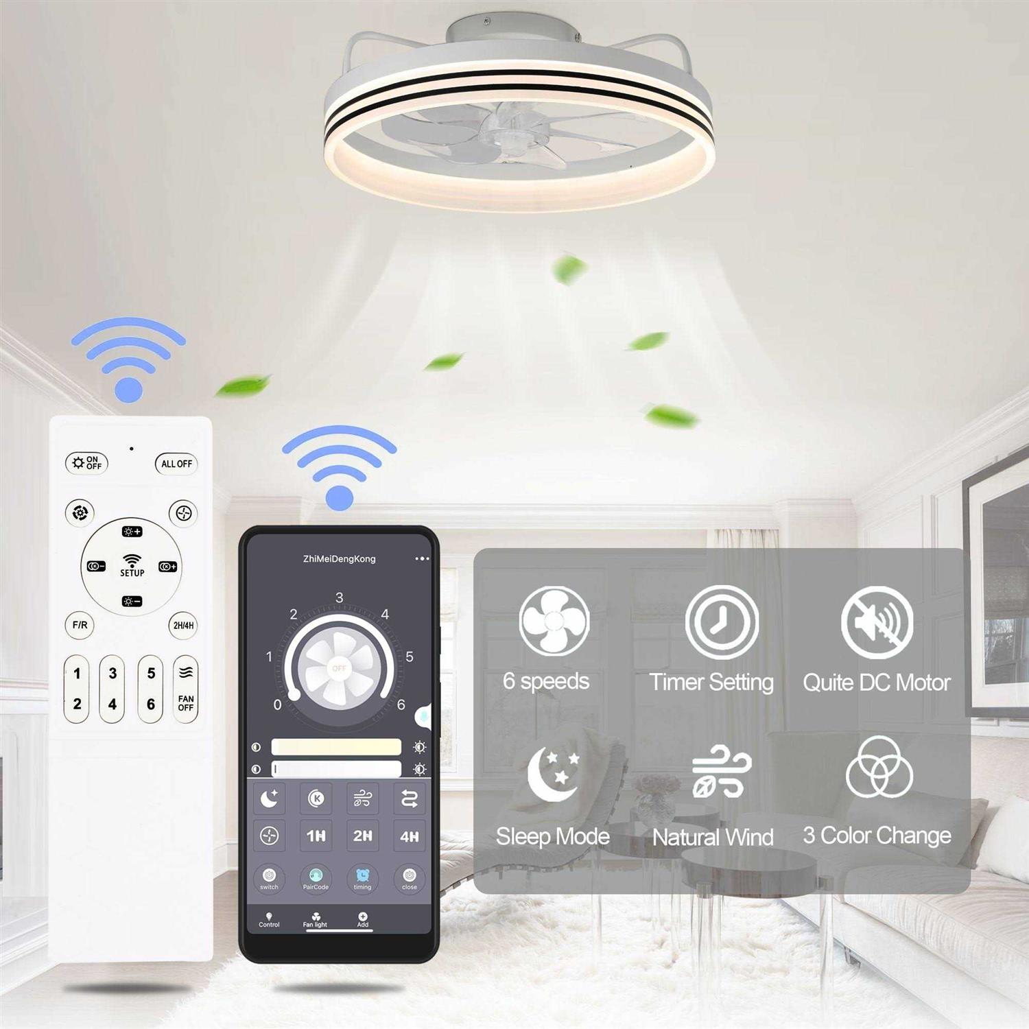 Upgrade your home decor and enjoy a cozy and inviting atmosphere with the Oaks Aura Bladeless Smart App Remote Control Low Profile 6-Speed Ceiling Fan. This beautiful flush mount ceiling fan with three light tones and dimmable LED lighting can be easily controlled through the included remote or App, allowing you to adjust the light and speed according to your preferences. The latest DC motor technology ensures powerful airflow while operating quietly, making it perfect for small to medium-sized rooms. With its modern and creative design, this ceiling fan is an ideal addition to any bedroom, living room, kitchen or kids’ room. Features: Smart App and Remote Control included Timer Setting included Sloped Ceiling Adaptable up to 15-30 Degree Material: Acrylic + metal Style: Modern/Simple/Creative Color temperature: Dimmable Light source type: LED Light Kit Included Speed: 6 Room Size: Small & Medium rooms (up to 12 x 14) UL Listed for core parts ETL Listed for ceiling fan ETL damp-rated for indoor or covered outdoor spaces Easy installation in just a few minutes Hardwired, Assembly Required Package Includes: Ceiling Fan with Light, Remote Control, Installation Manual