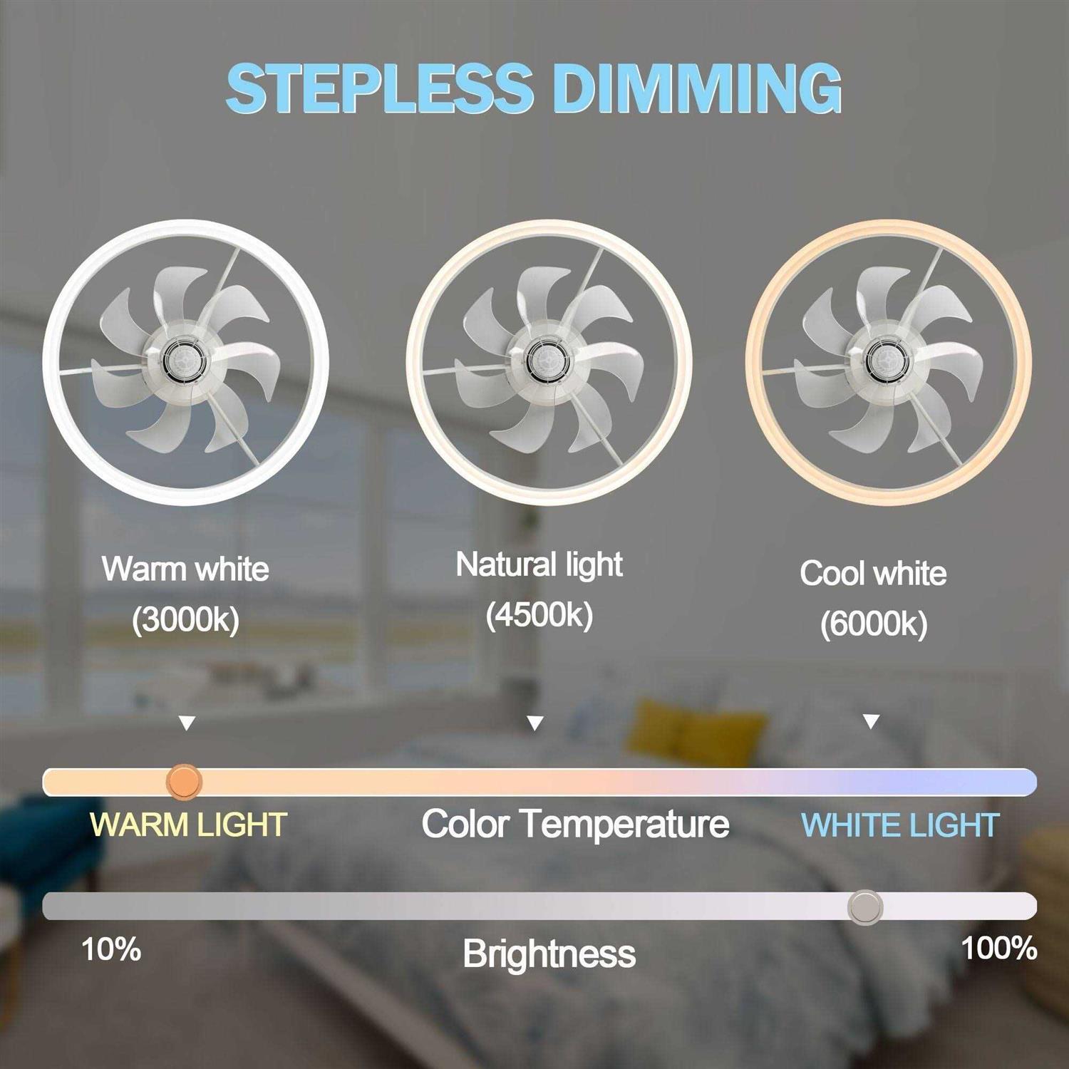 Upgrade your home decor and enjoy a cozy and inviting atmosphere with the Oaks Aura Bladeless Smart App Remote Control Low Profile 6-Speed Ceiling Fan. This beautiful flush mount ceiling fan with three light tones and dimmable LED lighting can be easily controlled through the included remote or App, allowing you to adjust the light and speed according to your preferences. The latest DC motor technology ensures powerful airflow while operating quietly, making it perfect for small to medium-sized rooms. With its modern and creative design, this ceiling fan is an ideal addition to any bedroom, living room, kitchen or kids’ room. Features: Smart App and Remote Control included Timer Setting included Sloped Ceiling Adaptable up to 15-30 Degree Material: Acrylic + metal Style: Modern/Simple/Creative Color temperature: Dimmable Light source type: LED Light Kit Included Speed: 6 Room Size: Small & Medium rooms (up to 12 x 14) UL Listed for core parts ETL Listed for ceiling fan ETL damp-rated for indoor or covered outdoor spaces Easy installation in just a few minutes Hardwired, Assembly Required Package Includes: Ceiling Fan with Light, Remote Control, Installation Manual