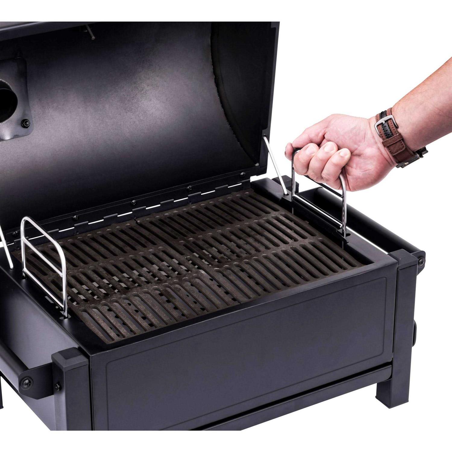 The Oklahoma Joe’s Rambler Tabletop Charcoal Grill offers portability, but never at the expense of quality. Its heavy-duty construction ensures supreme durability you can trust, the Oklahoma Joe’s Rambler Tabletop Charcoal Grill takes the best parts of a heavy-duty charcoal grill and reworks them for maximum portability. The height-adjustable charcoal tray allows you to grill with high heat or cook low and slow. The large air dampers give you full control of your temperature, while the thick cast-iron grates deliver sizzling sears for the perfect steak, burgers and more. The lid handle features an easy-to-grab rubber grip and stays cool to the touch. The full-size, removable ash pan makes clean up-easy. The professional temperature gauge has glow-in-the-dark accents. Sturdy side handles make transporting this portable grill easy. The Oklahoma Joe’s Rambler Tabletop Charcoal Grill is tough enough to be your at-home grill and versatile enough to hit the road with you.