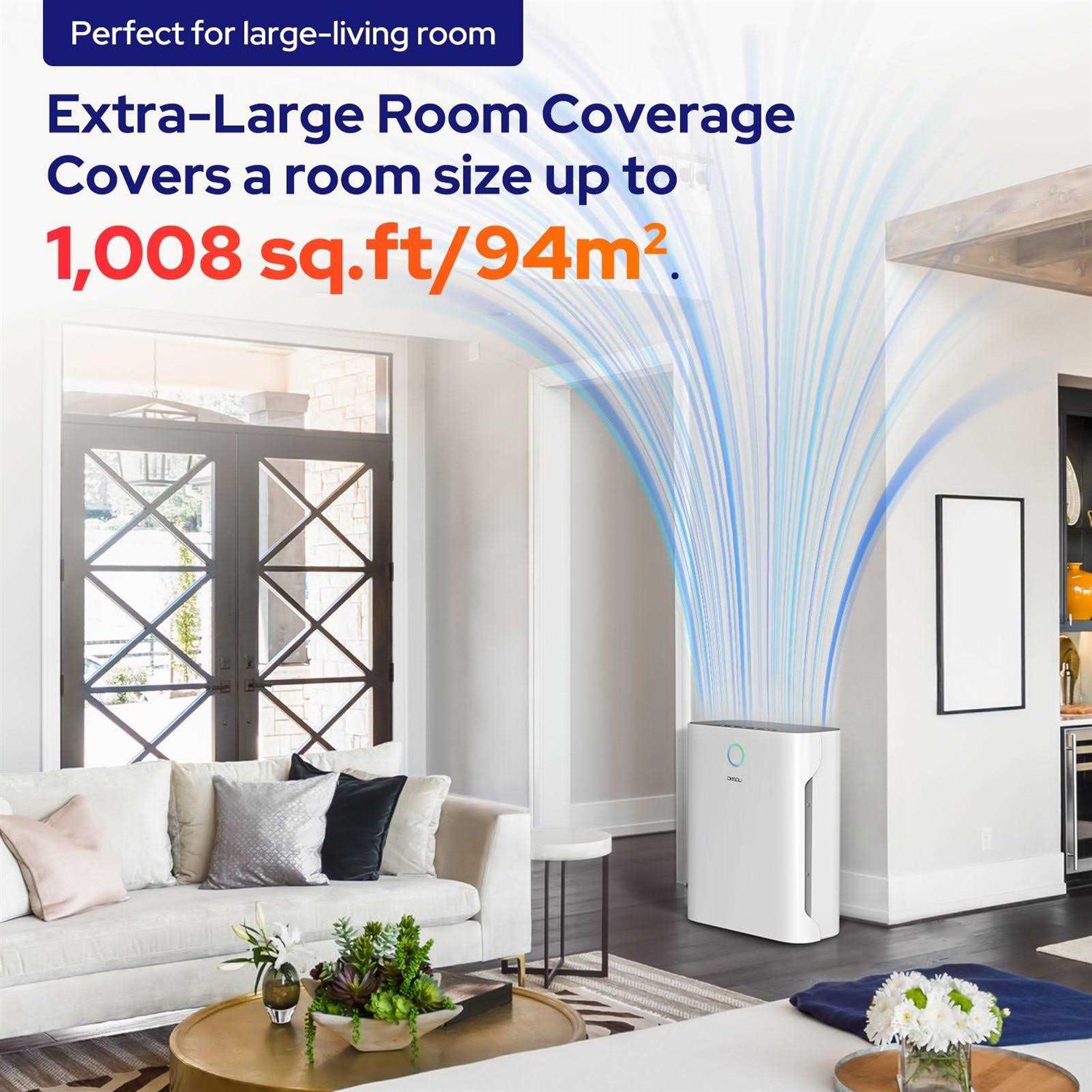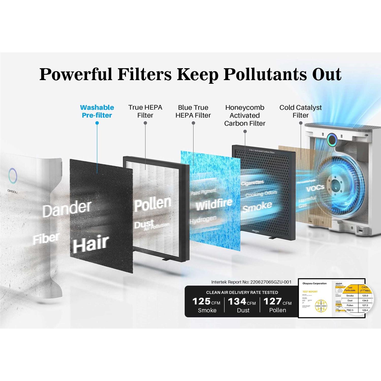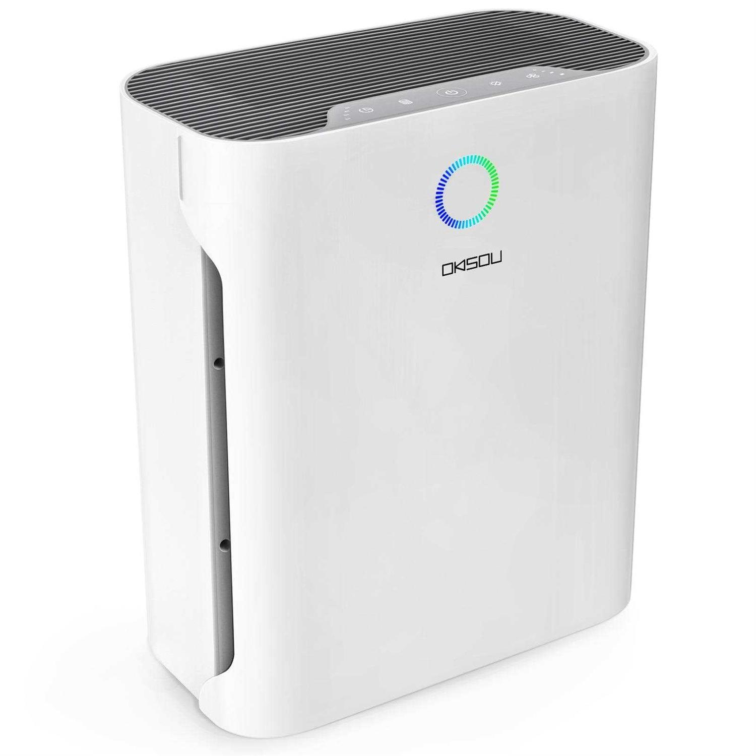 Efficient Air Purification – Refresh Your Air in Minutes: With a high CADR of 130 cfm/220m³/h, our purifier effectively cleans air in large rooms, covering 1008 sq.ft. in one hour, 504 sq.ft. in 30 minutes, 252 sq.ft. in 15 minutes, and 168 sq.ft. in 10 minutes. Compact and lightweight, it’s perfect for rooms of all sizes, including bedrooms, living rooms, offices, basements, family rooms, and kitchens. Powerful 5-Stage Filtration System – Our advanced system includes a Washable Pre-filter, H13 True HEPA Filter, Novel Blue Filter, Honeycomb Activated Carbon Filter, and Cold Catalyst Filter. It captures 99.97% of air pollutants as small as 0.3 microns, such as dust, pollen, smoke, hair, and household odors. Advanced Features – ⁕Sleep Mode ⁕Timer Mode ⁕Filter Replacement Indicator ⁕3 Fan Speed Settings: Conveniently set a timer for 2, 4, 6, or 8 hours. The Filter Replacement Indicator ensures timely filter changes. Adjust to 3 fan speeds for varying environments. The unit’s handle facilitates easy movement, and dual-sided air intake maximizes pollutant capture. The touch screen adds user-friendly control. Quiet Sleep Mode – Minimal Noise, Energy-Efficient: Operate the OKSOU Air Purifier all night with Sleep Mode. Running at the lowest fan speed (only 23dB) with the display off, it cleans your air without disrupting your sleep. Sleep mode is exceptionally energy-saving, making it ideal for quiet and clean ambiance during sleep, study, work, or any peaceful moments.