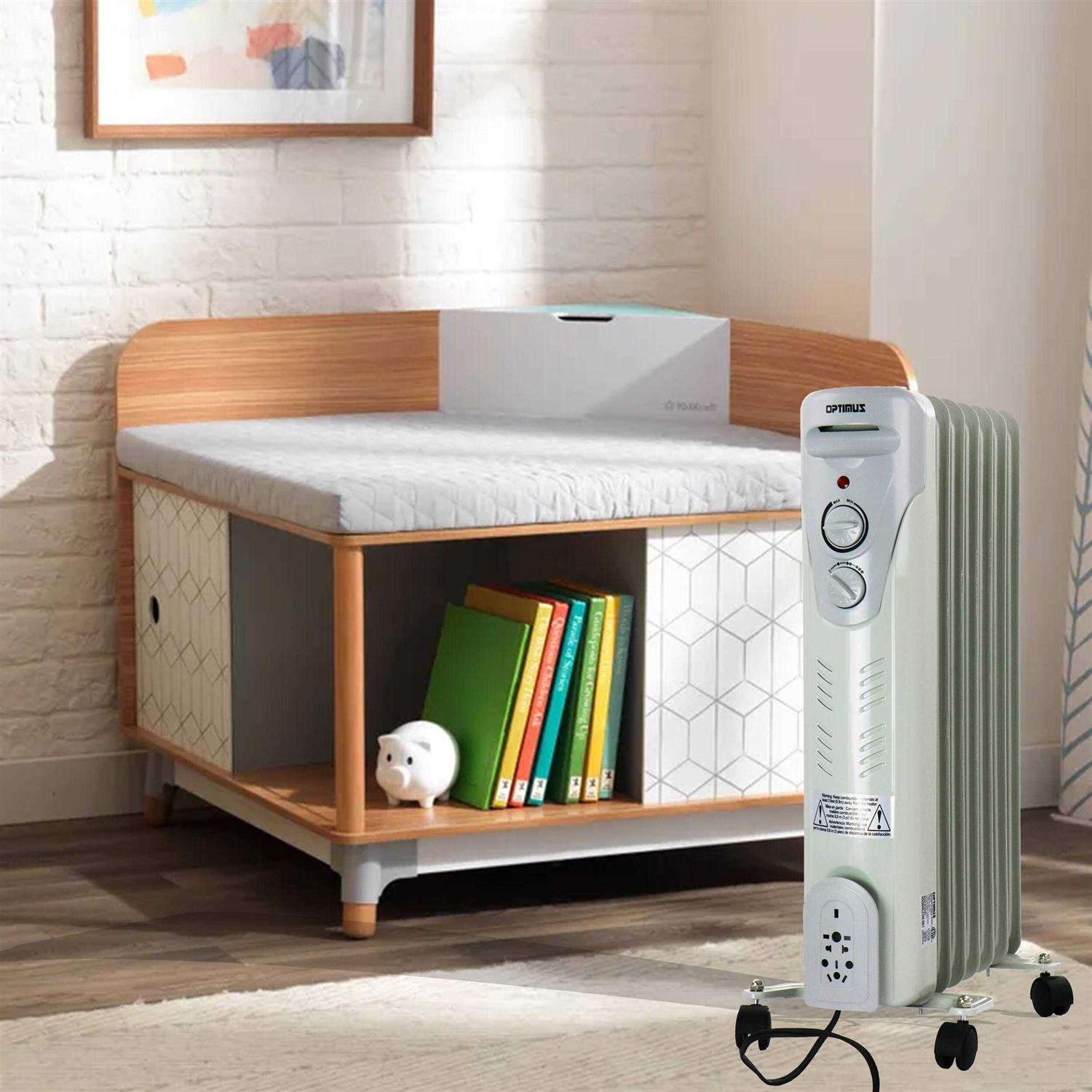 Need heat on the go? The Optimus H-6011 3-Setting 1,500-Max 7-Fin Portable Oil-Filled Radiator Heater with Thermostat and Wheels is a smart, safe, and savvy way to heat up the living spaces you hibernate in each winter for soothing, comforting heat. It has a slick design so it doesn’t take up too much room and is ideal for rooms like a bedroom, bathroom, kitchen, or office. It also has a large, wheeled base so you can easily move it from room to room.