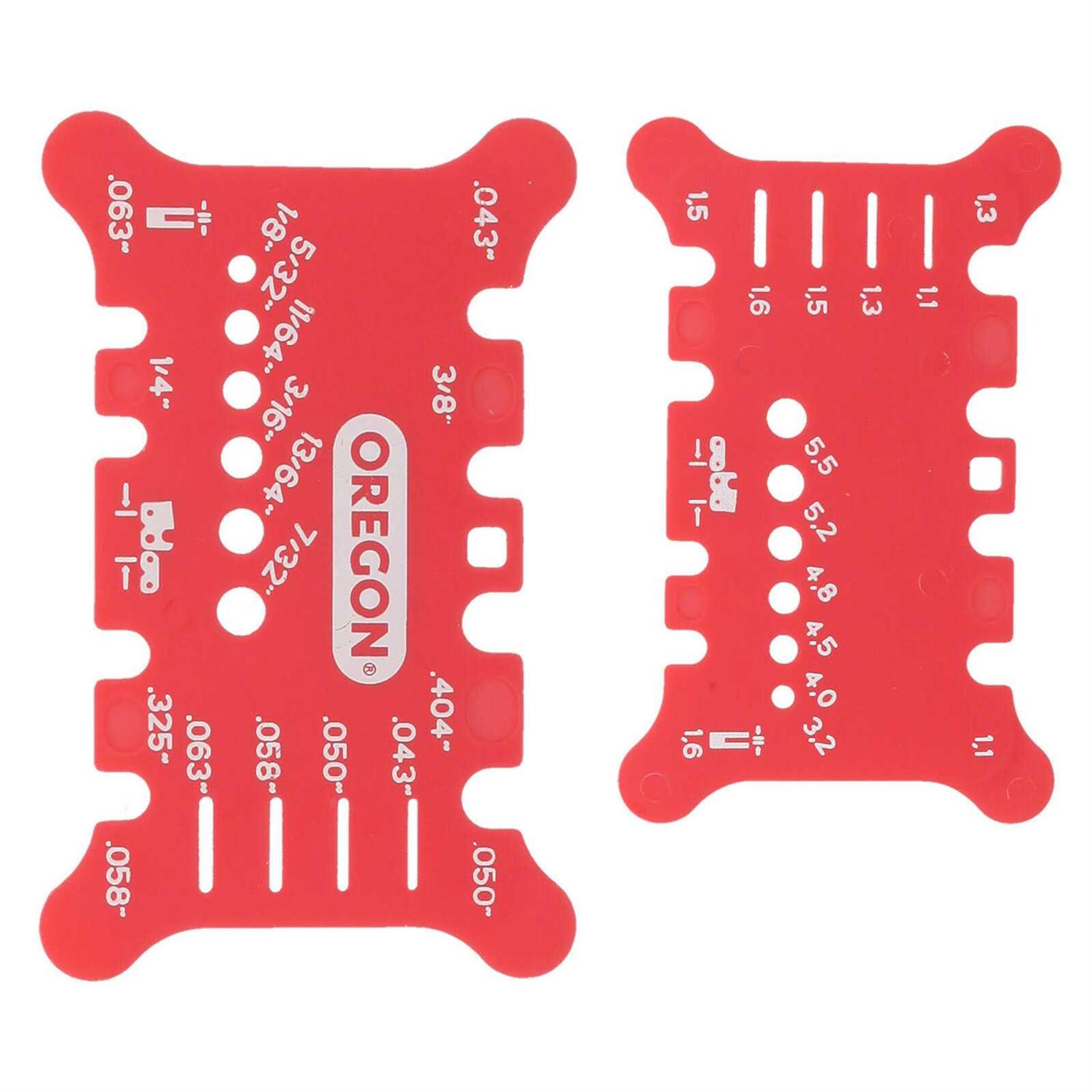 This pocket-sized gauge provides quick and easy identification of chain pitch, bar groove width, chain gauge and file size. Easily carried in a wallet or used as a keychain, this tool helps to determine the necessary measurements for chainsaw maintenance. With a vibrant red color, the gauge is simple to locate in a tool box. Access the included PDF Files for Bar and Chain Measuring Tool Instructions.