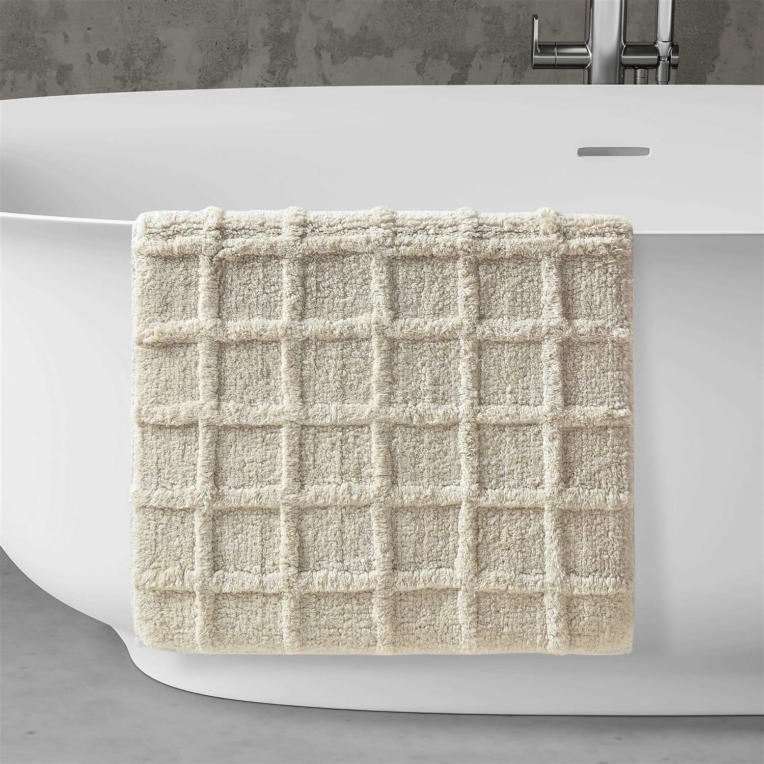 Add a clean classic touch to your bathroom decor with the Cameron Bath Rug. Constructed with 100% Cotton over-tufted panes that are highly absorbent and it features an anti-skid backing. It is super soft and machine washable for easy cleaning and long lasting durability. Pair this bath mat with the Cameron shower curtain and bedding collection to complete the trending modern look (Each sold separately). The texture rug is 20 inches long by 30 inches wide, which fits perfectly with most modern vanities.
