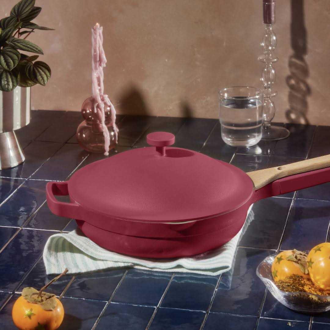 Meet your favorite essential kitchen pan in Rosa. Thoughtfully designed to be the perfect size and shape to do the work of 10 pieces of traditional cookware. Our proprietary nonstick ceramic is the best on the market, and made without any harmful chemicals like PFAS. Stylish and sturdy enough to go from stovetop to oven to table. Complete cooking pan with a lid, spatula, and steamer basket.