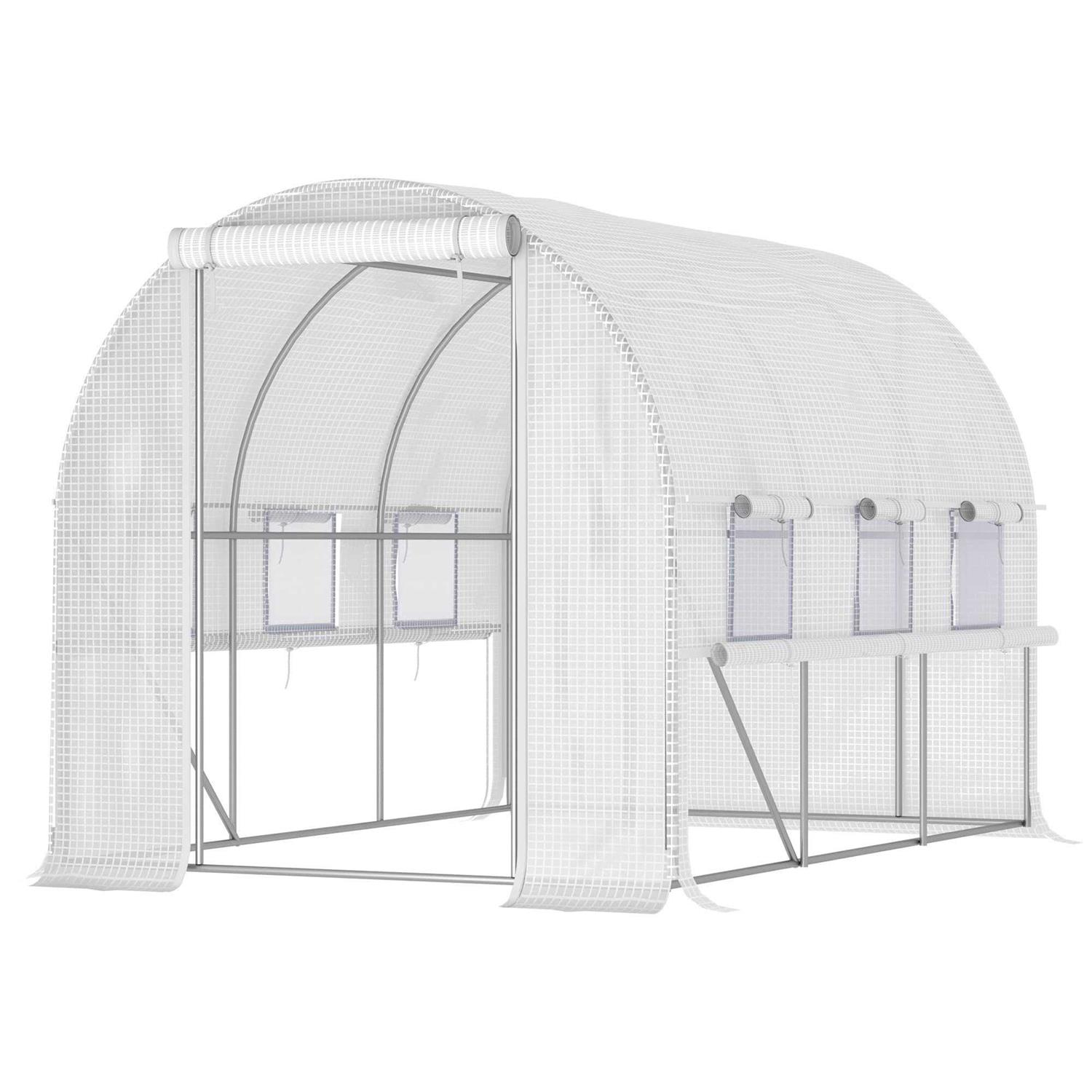 Extend The Growing Season: Our walk-in backyard greenhouse tent creates a large space for you to start up seeds and protects plants from fluctuating temperatures. Extend the growing season and end your winter woes in milder climates. Roll-Up Doors, Windows & Sidewalls: The large, zipped roll-up doors provide easy access to your green greenhouse, and the mesh windows keep out unwanted guests with wings. Multiple openings allow for cross ventilation, so temperature and humidity are in your hands. High-quality PE Cover: Our two-layer 140 GSM PE cover features a reinforcement grid through the middle to prevent tearing. It protects plants from UV scorching while allowing 85% of nourishing sunlight to pass through uninterrupted. Steel Structure: The large greenhouse is composed of seven crossbars, two diagonal braces, and a reinforcing ground frame, all made of water-safe, bend-resistant galvanized steel. Formed into an arch shape, the top prevents sagging and allows it more stability against wind and rain. For added support, bury the extended edges deep in the soil and pull guy ropes tightly from the ground stakes. Outdoor Greenhouse Info: Overall Dimensions: 116.25″ L x 78.75″ W x 78.75″ H. Window Dimensions: 18″ L x 15.75″ W. Recommended that 1-2 people assemble it. Description: /b br br Extend the growing season and keep your shovel in the soil this winter with Outsunny. Mild winters aren’t a problem for our polytunnel greenhouse. When winter frost brings its wavering temperatures, ensure your plants are protected. Enjoy fresh vegetables, onion, salads, and homegrown tomatoes year-round. Easy to access and ventilate with roll-up walls, doors, and windows, heat, UV, and humidity are in your hands. Made with water-safe galvanized steel, exercise your green thumb with Outsunny. br br Features: /b br br The translucent PE cover offers UV protection to keep plants safe from harsh sunlight br Roll up doors, windows, and sidewalls for better cross ventilation and to control temperature and humidity br Arched roof to prevent water from accumulating br Galvanized steel pipe is water-safe and bend resistant br Seven crossbars, two reinforced inclined bars, and a ground frame br Assembly required br br br Specifications: /b br br Color: White br Material: Galvanized Steel, Polyethylene br Overall Dimensions: 116.25″ L x 78.75″ W x 78.75″ H br Window Dimensions: 18″ L x 15.75″ W br Door Dimensions: 41.25″ W x 72.75″ H (Front), 108.25″ W x 27.5″ H (Side) br Item Label: 845-611WT br br br Package Includes: /b br br – 1 x Greenhouse br – 4 x Wind Rope br – 4 x Ground Stake br – 1 x Manual br br br