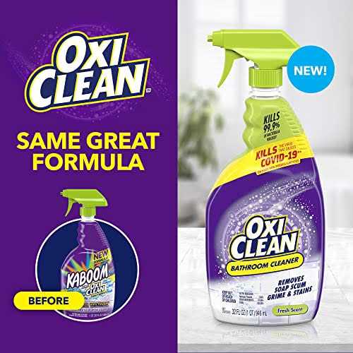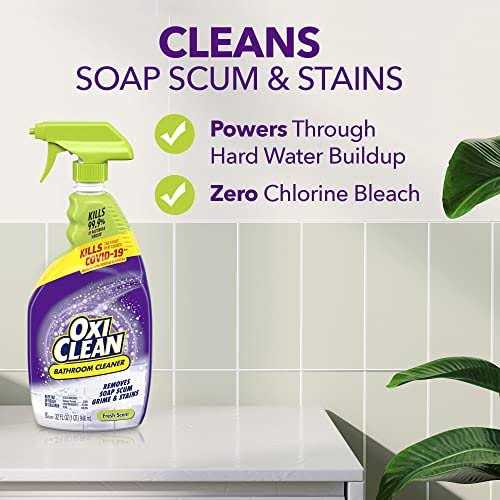 Got tough bathroom stains? OxiClean Bathroom Cleaner is a powerful cleaner designed to tackle your bathroom’s toughest stains. The chlorine bleach-free formula uses the power of oxygen and stain-fighting bubbles to penetrate and remove gunk and grime. Use it as a tile cleaner and tub cleaner to power through soap scum, hard water buildup, and calcium and lime stains. Kills 99.9% of bacteria and viruses when used as directed. Use on surfaces such as showers, glass doors, glazed tile and porcelain, chrome and stainless steel, sinks, tubs, grout, and plastic laminate. Use for a fresh-scented bathroom.