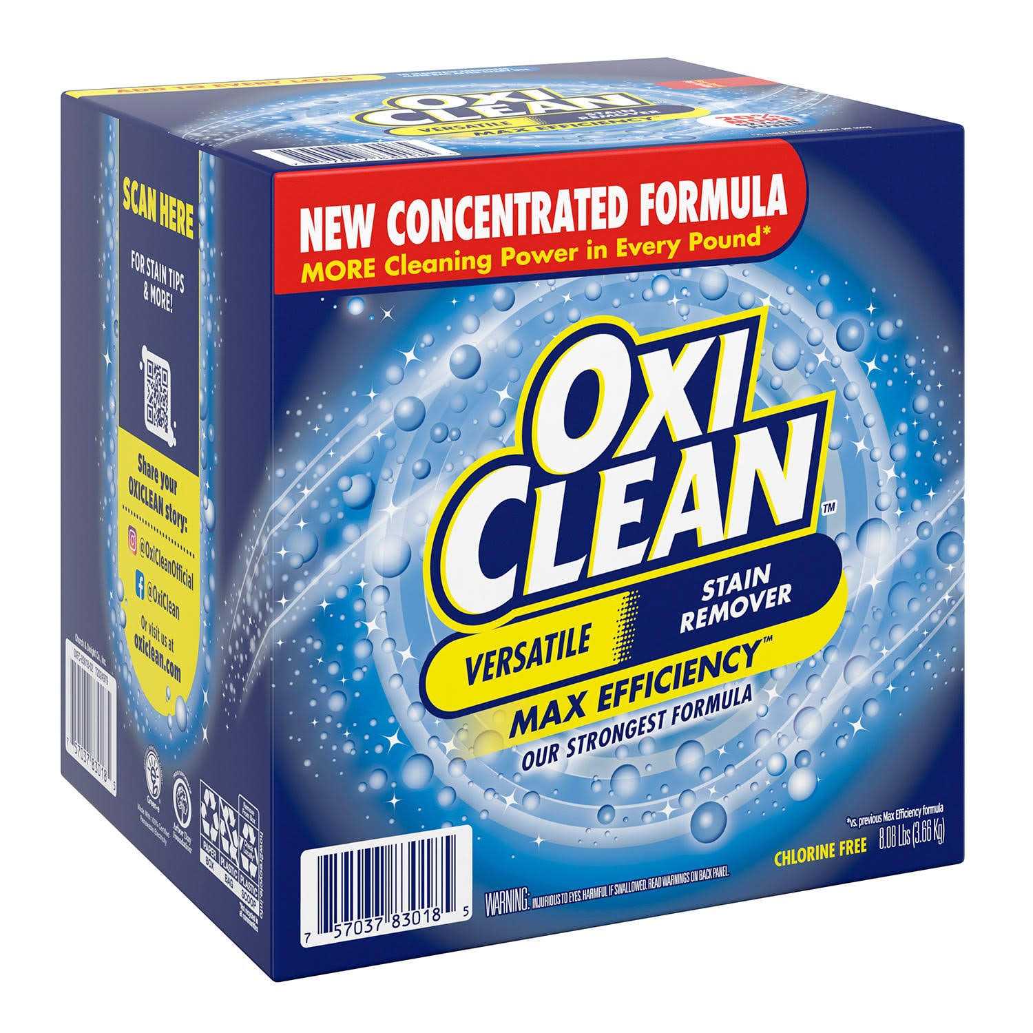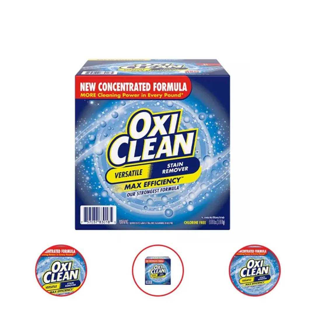 OxiClean Max Efficiency Versatile Stain Remover Powder (8.08 lbs.), with our new formula, has more cleaning power in every pound! Our strongest formula available has been concentrated so you can use less per scoop while getting the same powerful clean and same number of uses as the previous 10.1 lbs size. It’s safe for whites and colors, so use it in every load or around the home. When used as directed, its oxygen-based water-activated formula safely gets tough dirt and grime out of clothes, carpets and nearly any surface in your home.