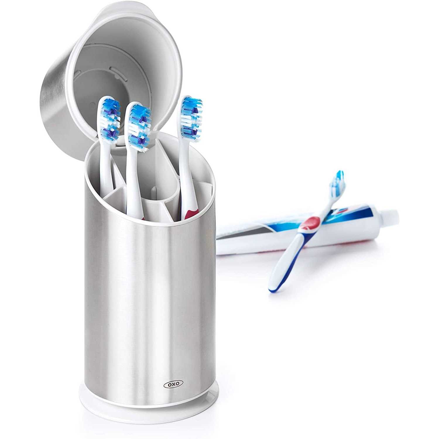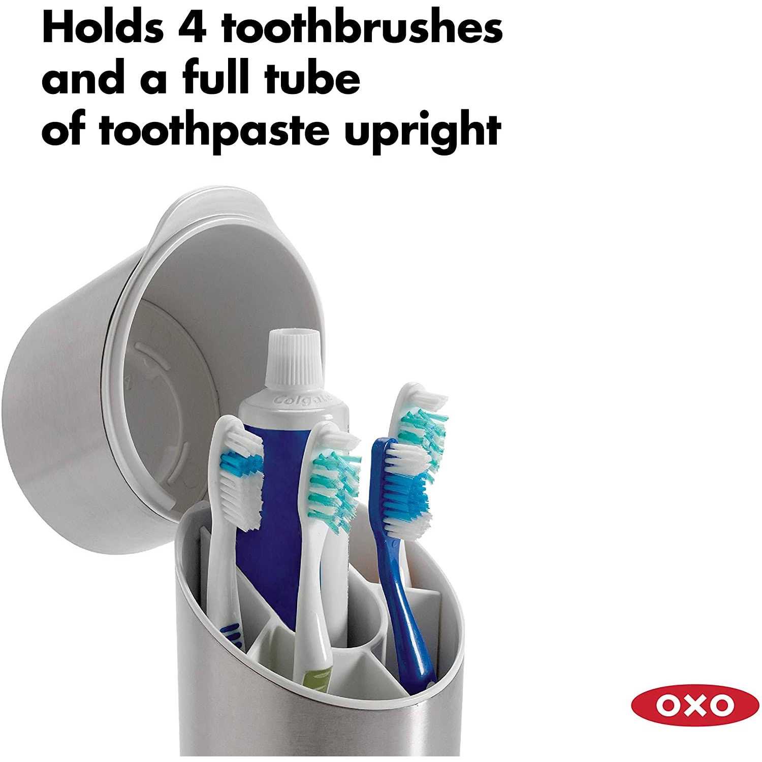 Item Package Quantity: **1** | Size: **9.75 Inch** ### Product Description OXO Good Grips Stainless Steel Toothbrush OrganizerThe OXO Good Grips Stainless Steel Toothbrush Organizer is an elegant solution for storing and protecting up to four toothbrushes and a full tube of toothpaste. The wide- angled opening makes it easy to access contents inside, while rings inside the Organizer keep toothbrushes steady and upright. The internal divider accommodates toothbrushes with large ergonomic handles and can easily be removed for cleaning. Air vents on the top and bottom help toothbrushes dry after use. Product Measures: 9. 5 IN x 3. 75 IN x 4. 125 IN ### Brand Story By
