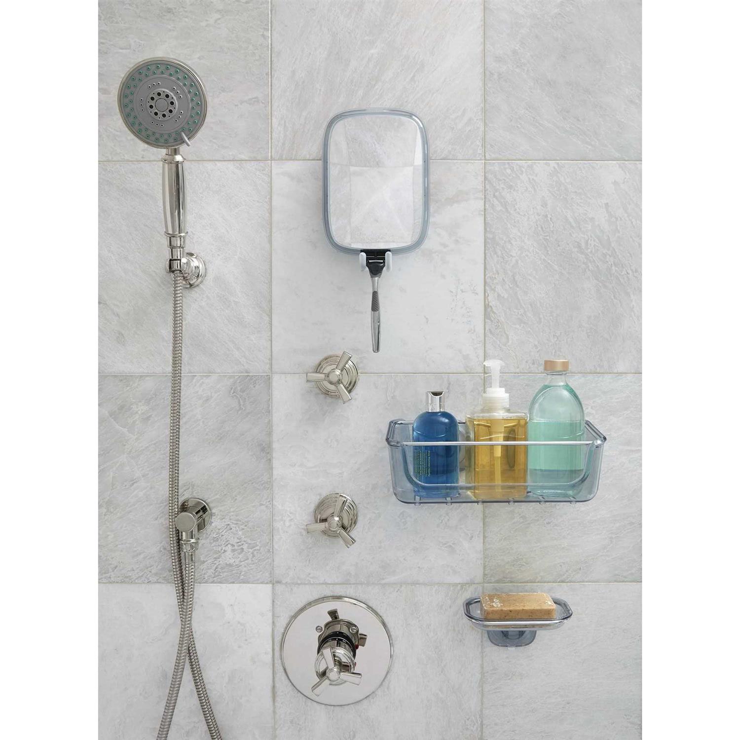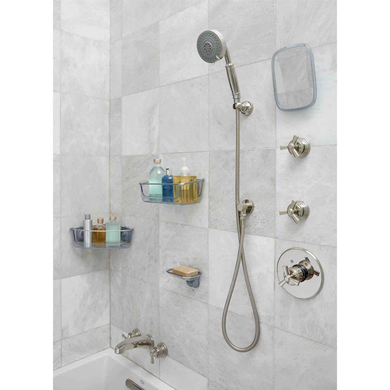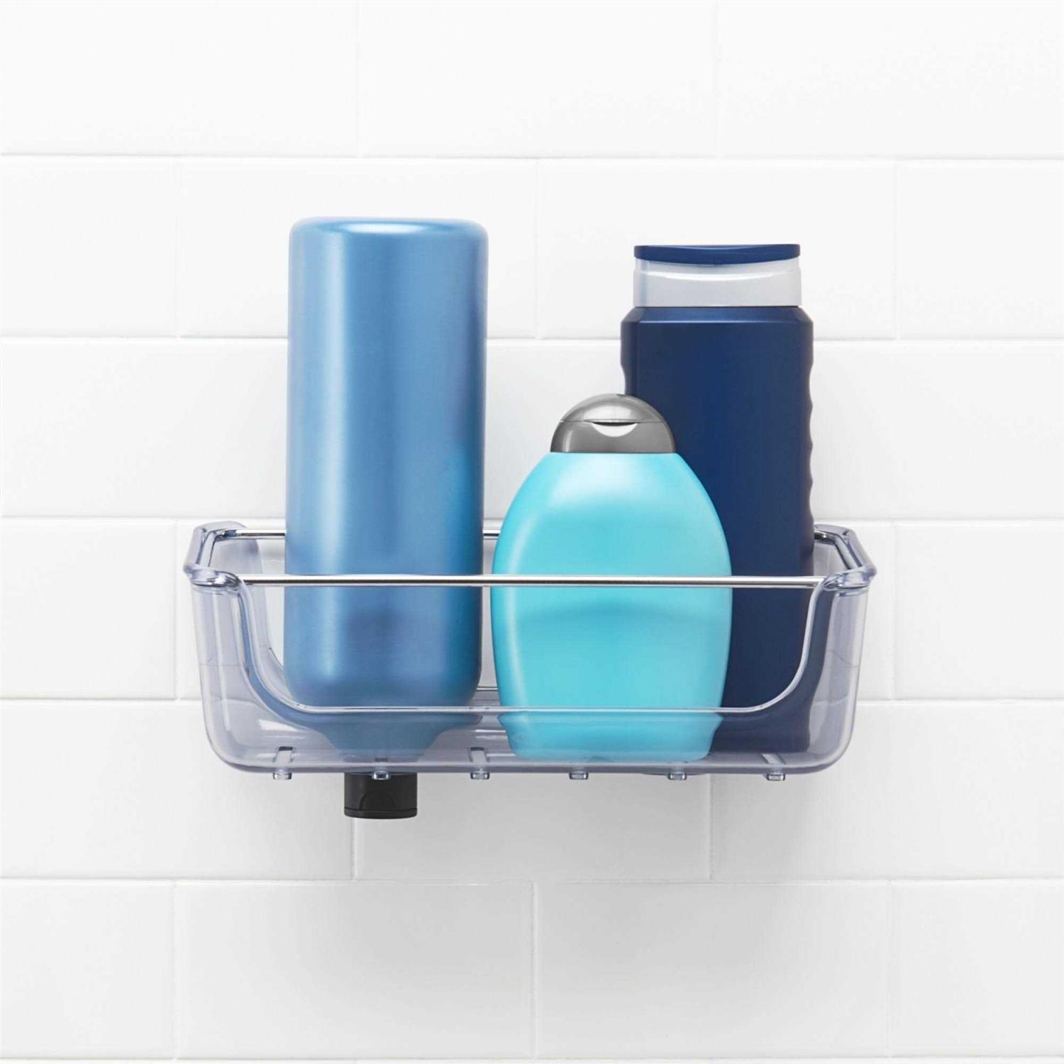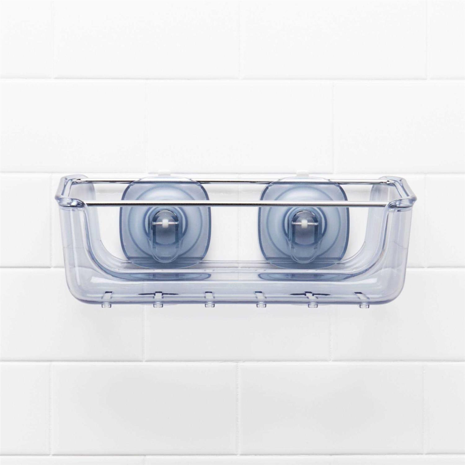 Suction Shower Basket, 11” x 5.5” x 4” H / 28 x 14 x 10cm H. Large-capacity basket keeps shampoo, conditioner, and other shower bottles close at hand. A washcloth bar keeps face cloths and other shower accessories off the floor and within easy reach. Holes in base for storing bottles upside down. StrongHold suction cups activate with the push of a button. Cups attach securely to tile, glass and other smooth, non-porous surfaces. Cups slide to avoid grout lines. Release tabs quickly deactivate suction for repositioning or removal. Ventilated base for quicker drying.