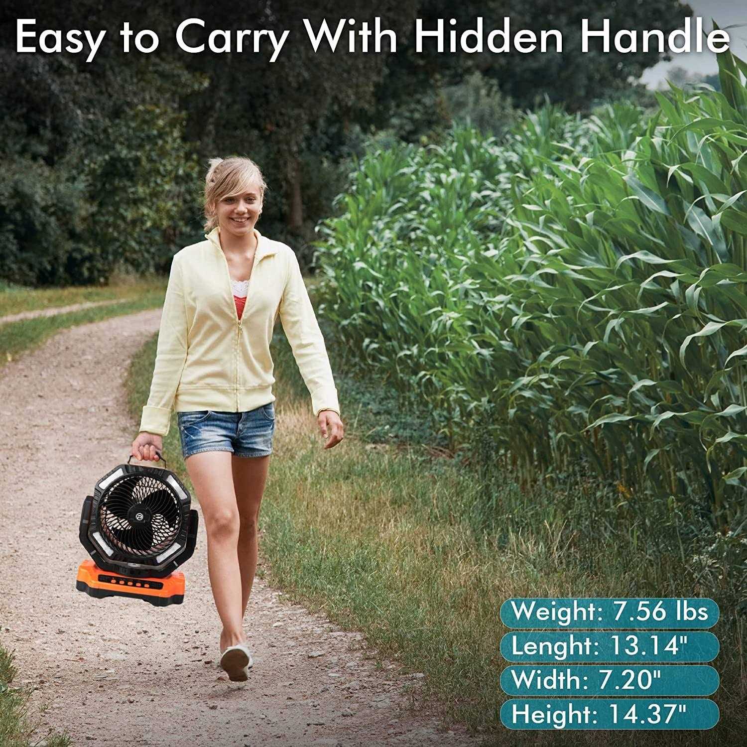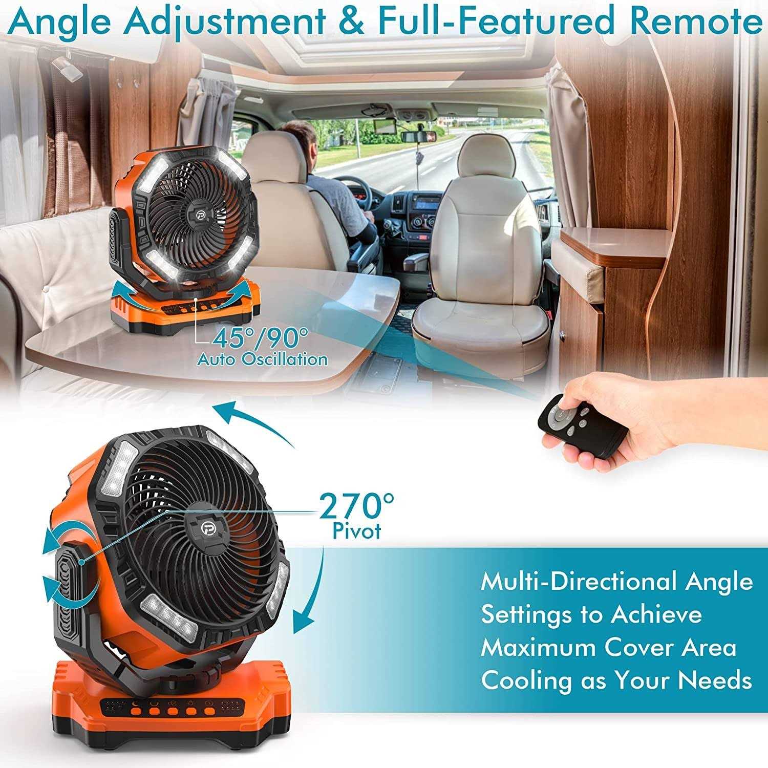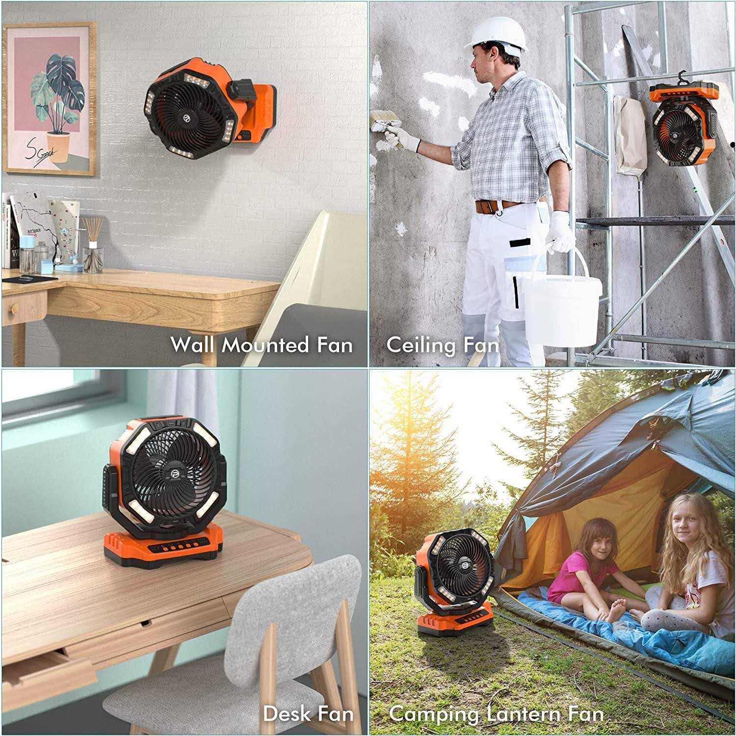 Powered by 20000mAh rechargeable battery and compose of 16 LED light beads, with a remote, timers, double triblade, auto-oscillation and 270° pivot design. Made of sturdy and durable ABS material for anti-drop and anti-collision. The fan is a good helper for jobsite, camping trip, power outage, hurricane and also for indoor use as a desk fan when studying, working, reading, etc. Color: Orange.