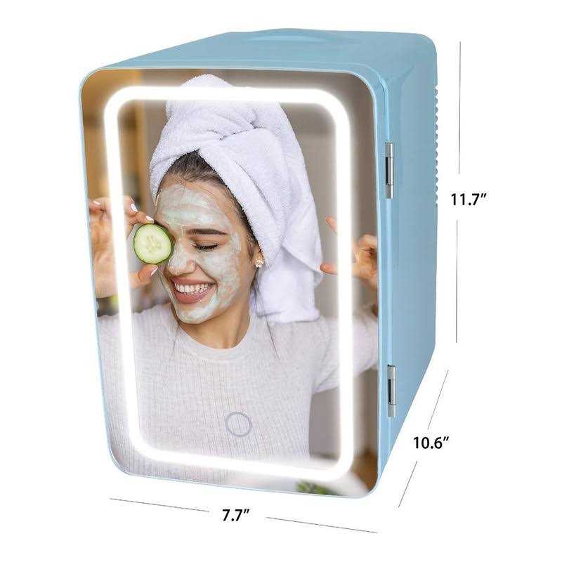 Hello Beautiful! This Mini Fridge has it all! The Personal Chiller with LED Lighted Mirror has a 6-liter capacity ideally sized for storing not just beverage cans and snacks, but also organic, preservative-free skincare products, sheet masks, and beauty tools. Skincare products maintained and applied at cooler temperatures help make your skin feel refreshed and rejuvenated. Dedicated, customizable space just the way you like it with a removable, two-position adjustable shelf and inside door storage rack. Configure Personal Chiller your way with cold beverages, snacks, and more – saving a trip to the main fridge.