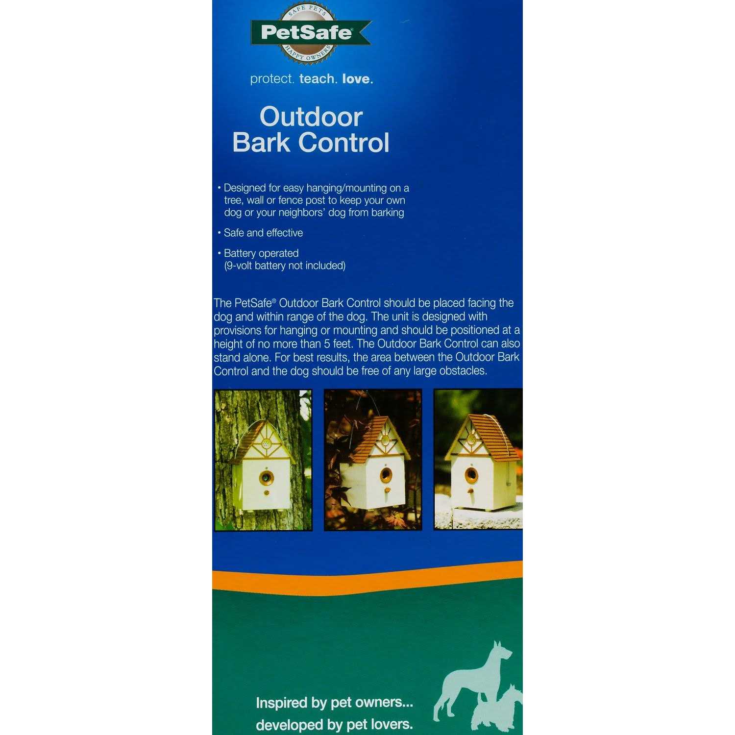 PetSafe Outdoor Bark Control Whenever your dog – or your neighbor’s dog – barks, he will hear a safe, high-pitched sound (inaudible to most humans) that will cue him to stop his annoying habit. Modeled to look like a birdhouse, the bark controller is battery-operated and has three settings plus a test option. Our ultrasonic outdoor bark control unit looks like any ordinary birdhouse that can hang in a tree, on a fence post or anywhere outside. Features: Stop your barking dog Stop your neighbors’ barking dog Train puppies not to bark Range: Up to 50 feet 3 range settings Durable and weatherproof Two-color LED for good/low-battery indication Uses 9v alkaline battery (not included) Item Specifications: Size: 9″L x 6″W x 6″D