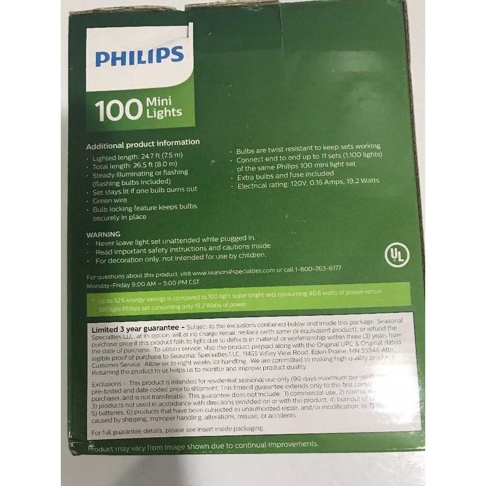 Create a festive glow with your holiday decorations with the Philips 100LT Mini Bulbs in clear color with green wire. These energy saving lights are Energy Star rated for use both indoors and out. Strings have a lighted length of 24.7′ and a total of 11 sets can be connected end to end for a total of 1,100 bulbs. Bulbs are twist resistant with a bulb locking feature that keeps them securely in place.