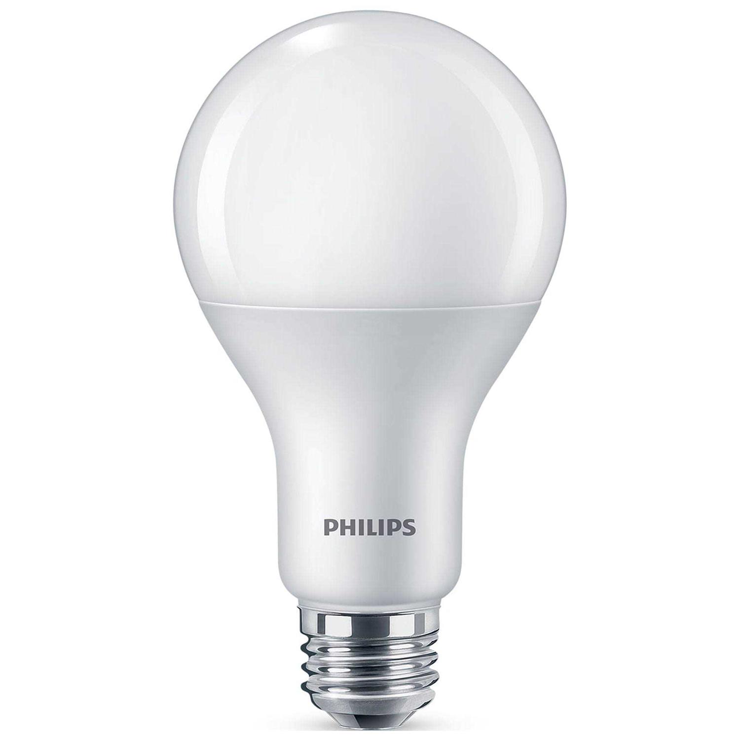 Philips High Lumen A21 LED light bulbs provide 2610 lumens of soft white light, equivalent to 150 Watt incandescents with 80 percent less energy use. These bulbs fit standard medium base (E26) fixtures with the look and feel of a classic bulb. Not for use with Philips HUE products. Dimming offers flicker free, silent dimming that works with more dimmer switches than any other LED on the market. Philips LEDs are mercury free so they don’t contribute to harmful hazardous waste. The E26 medium base fits standard fixtures on pendant, vanity, and bare lamps. This pack of A21 LED is expected to deliver a lifetime of up to 25,000 hours and over 20 years based on standard usage of three hours per day, saving you the cost and hassle of frequent bulb replacement.
