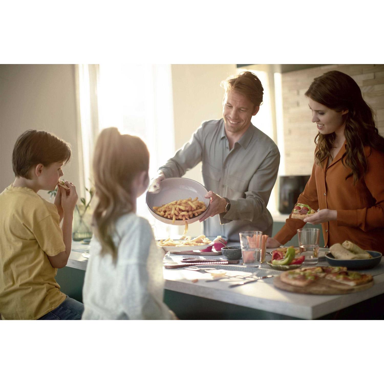Bid your deep-fry thermometer goodbye. Using this Philips airfryer with Rapid Air technology, you can make delicious dishes that are just as crisp and satisfying as deep-fried food – with 90% less fat. With little or no added oil, fried chicken, tacos, egg rolls and even tempura vegetables emerge hot and tasty. In addition to airfrying, the versatile machine also excels at grilling, roasting, baking and reheating. An essential for any kitchen, it features a compact design that takes up minimal counter space. Produces food with 90% less fat than traditional deep-frying methods. Patented “starfish” design exposes food to constant circulating heat. Excels at airfrying, grilling, roasting, baking and reheating. Digital touchscreen features 7 presets. Keep warm function. Access hundreds of recipes on Philips Kitchen app.